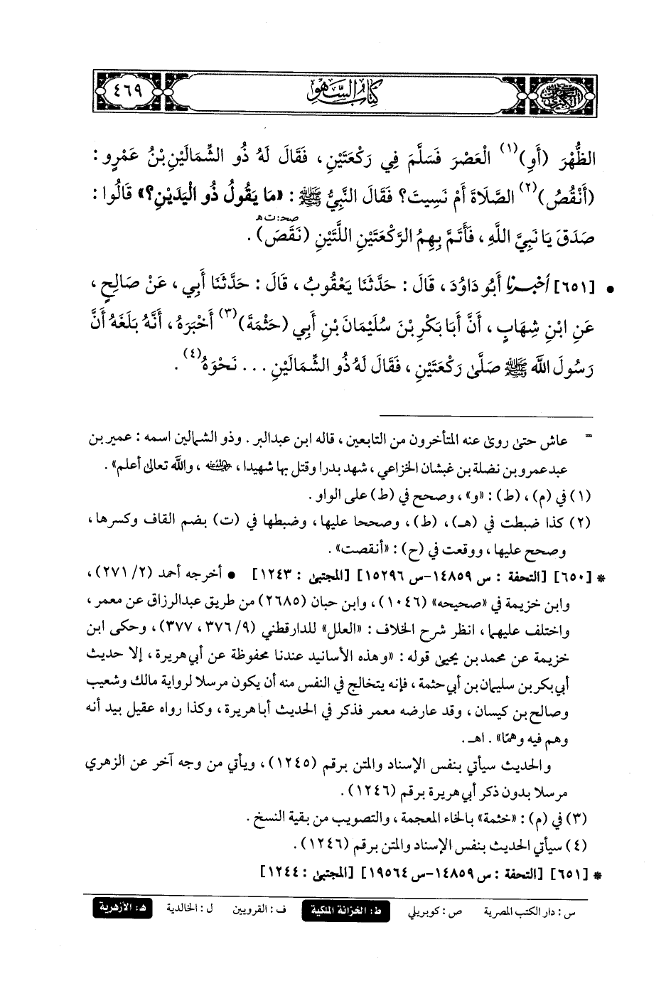 651- أَخبَرنا أَبو دَاوُدَ، قَالَ: حَدثنا يَعقُوبُ، قَالَ: حَدثنا أَبي، عَن صَالِحٍ، عَنِ ابنِ شِهَابٍ، أَنَّ أَبَا بَكْرِ بْنَ سُلَيمَانَ بنِ أَبي حَثْمَةَ أَخبَرَهُ، أَنَّهُ بَلَغَهُ أَنَّ رَسُولَ اللهِ صَلى الله عَليه وسَلم صَلَّى رَكْعَتَيْنِ، فَقَالَ لَهُ ذُو الشِّمَالَيْنِ... نَحْوَهُ.