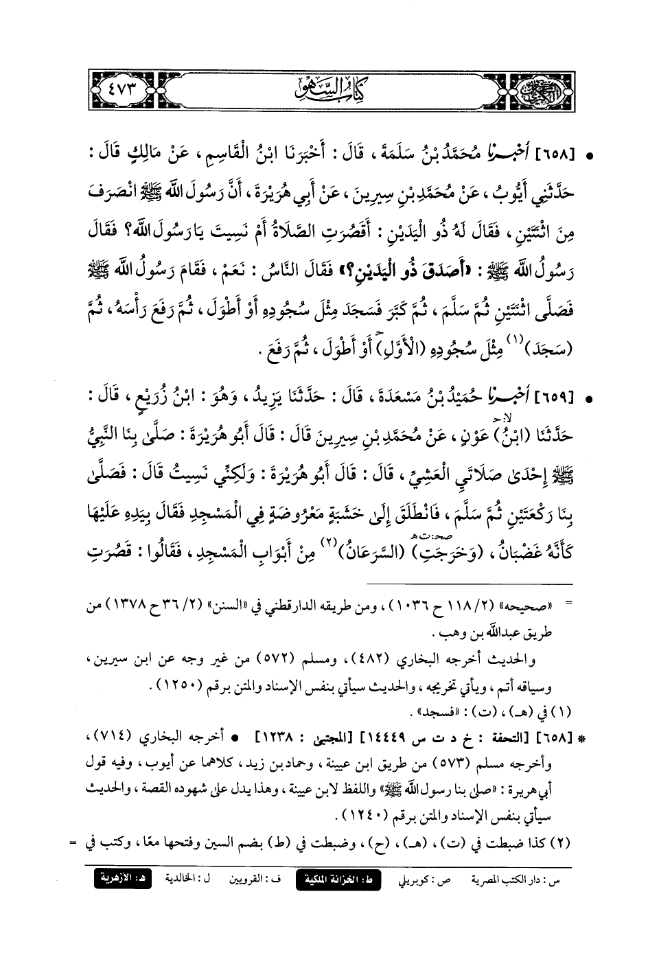 658- أَخبَرنا مُحَمدُ بنُ سَلَمَةَ، قَالَ: أَخبَرنا ابنُ القَاسِمِ، عَن مَالِكٍ، قَالَ: حَدَّثني أَيوبُ، عَن مُحَمدِ بنِ سِيرِينَ، عَن أَبي هُرَيرَةَ، أَنَّ رَسُولَ اللهِ صَلى الله عَليه وسَلم انْصَرَفَ مِنَ اثْنَتَيْنِ، فَقَالَ لَهُ ذُو اليَدَيْنِ: أَقَصُرَتِ الصَّلاةُ أَمْ نَسِيتَ يَا رَسُولَ اللهِ؟ فَقَالَ رَسُولُ اللهِ صَلى الله عَليه وسَلم: أَصَدَقَ ذُو اليَدَيْنِ؟ فَقَالَ النَّاسُ: نَعَمْ، فَقَامَ رَسُولُ اللهِ صَلى الله عَليه وسَلم، فَصَلَّى اثْنَتَيْنِ، ثُمَّ سَلَّمَ، ثُمَّ كَبَّرَ، فَسَجَدَ مِثْلَ سُجُودِهِ أَوْ أَطْوَلَ، ثُمَّ رَفَعَ رَأْسَهُ، ثم سَجَدَ مِثْلَ سُجُودِهِ الأَوَّلِ أَوْ أَطْوَلَ، ثُمَّ رَفَعَ.