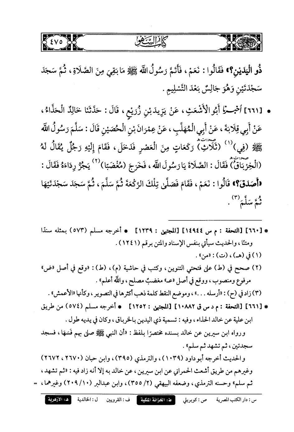 661- أَخبَرنا أَبو الأَشْعَثِ، عَن يَزِيدَ بنِ زُرَيْعٍ، قَالَ: حَدثنا خَالِدٌ الحَذَّاءُ، عَن أَبي قِلابَةَ، عَن أَبي المُهَلَّبِ، عَن عِمْرَانَ بنِ الحُصَيْنِ قَالَ: سَلَّمَ رَسُولُ اللهِ صَلى الله عَليه وسَلم فِي ثَلاثِ رَكَعَاتٍ مِنَ العَصْرِ فَدَخَلَ فَقَامَ إِلَيْهِ رَجُلٌ يُقَالُ لَهُ: الخِرْبَاقُ، فَقَالَ: الصَّلاةَ يَا رَسُولَ اللهِ، فَخَرَجَ مُغْضِبًا يَجُرُّ رِدَاءَهُ، فَقَالَ: أَصَدَقَ؟ قَالُوا: نَعَمْ، فَقَامَ فَصَلَّى تِلْكَ الرَّكْعَةَ، ثُمَّ سَلَّمَ، ثُمَّ سَجَدَ سَجْدَتَيْهَا، ثُمَّ سَلَّمَ.