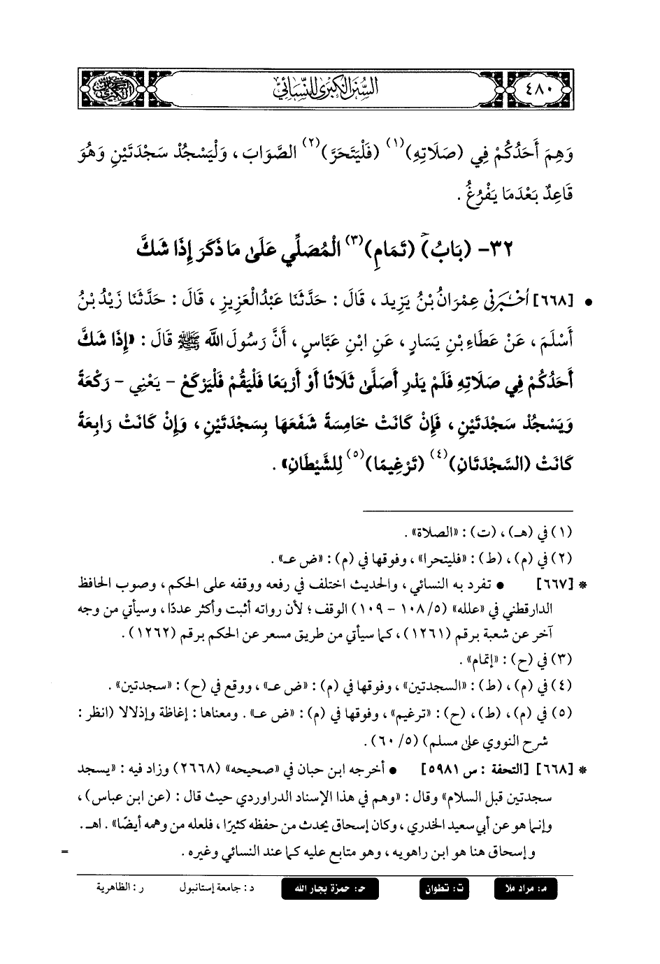 668- أَخبَرني عِمْرَانُ بنُ يَزِيدَ، قَالَ: حَدثنا عَبدُ العَزِيزِ، قَالَ: حَدثنا زَيْدُ بنُ أَسْلَمَ، عَن عَطَاءِ بنِ يَسَارٍ، عَنِ ابنِ عَبَّاسٍ، أَنَّ رَسُولَ اللهِ صَلى الله عَليه وسَلم قَالَ: إِذَا شَكَّ أَحَدُكُمْ فِي صَلاتِهِ فَلَمْ يَدْرِ أَصَلَّى ثَلاثًا أَوْ أَرْبَعًا، فَلْيَقُمْ فَلْيَرْكَعْ، يَعْنِي رَكْعَةً، وَيَسْجُدُ سَجْدَتَيْنِ، فَإِنْ كَانَتْ خَامِسَةً شَفَعَهَا بِسَجْدَتَيْنِ، وَإِنْ كَانَتْ رَابِعَةٌ كَانَتِ السَّجْدَتَانِ تَرْغِيمًا لِلشَّيْطَانِ.