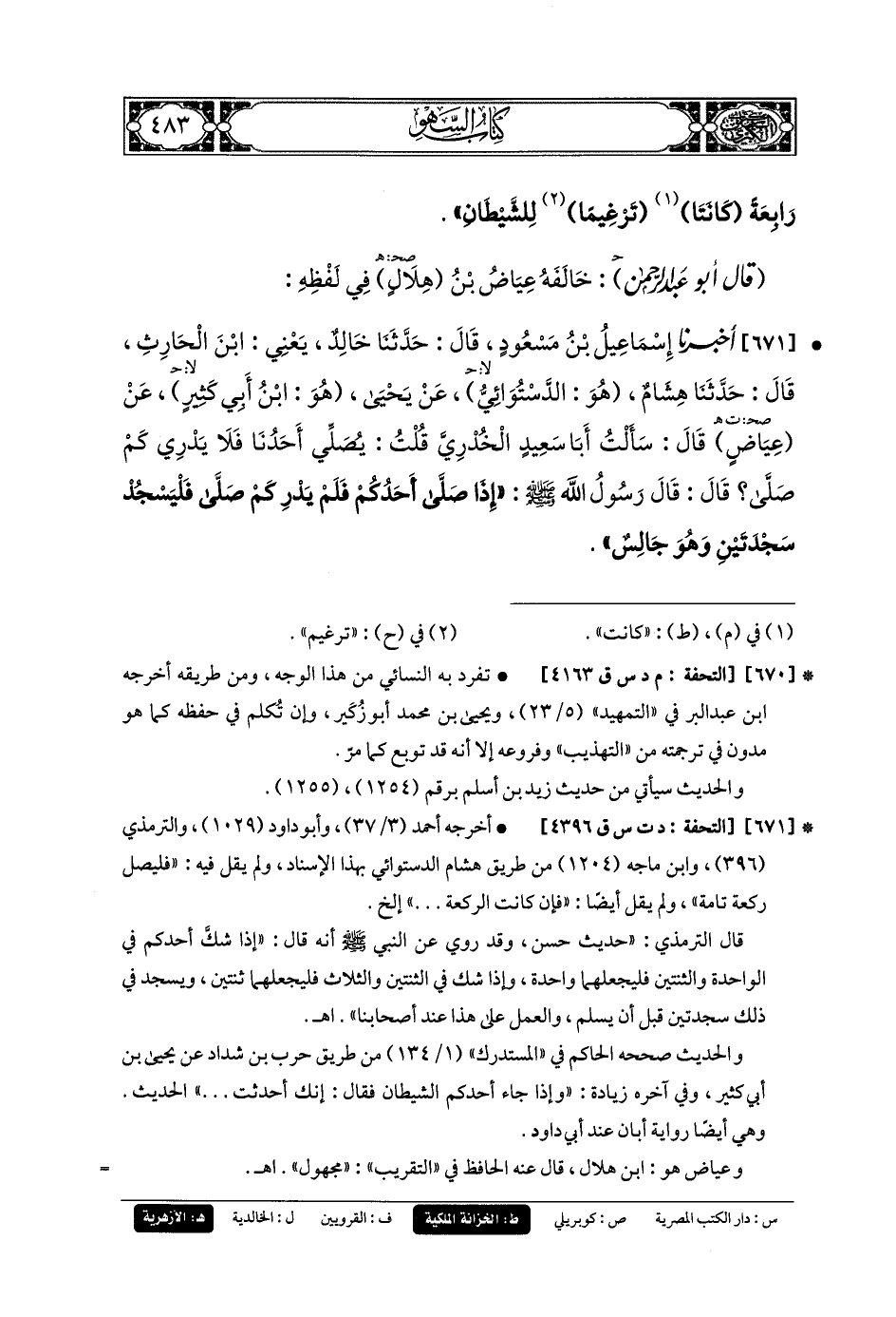 671- أَخبَرنا إِسمَاعِيلُ بنُ مَسْعُودٍ، قَالَ: حَدثنا خَالِدٌ، يَعْنِي ابنَ الحَارِثِ، قَالَ: حَدثنا هِشَامٌ، هُوَ الدَّسْتُوَائِيُّ، عَن يَحيَى، هُوَ ابنُ أَبي كَثِيرٍ، عَن عِيَاضٍ قَالَ: سَأَلْتُ أَبَا سَعِيدٍ الخُدْرِيِّ، قُلْتُ: يُصَلِّي أَحَدُنَا فَلا يَدْرِي كَمْ صَلَّى؟ قَالَ: قَالَ رَسُولُ اللهِ صَلى الله عَليه وسَلم: إِذَا صَلَّى أَحَدُكُمْ فَلَمْ يَدْرِ كَمْ صَلَّى، فَلْيَسْجُدْ سَجْدَتَيْنِ وَهُوَ جَالِسٌ.