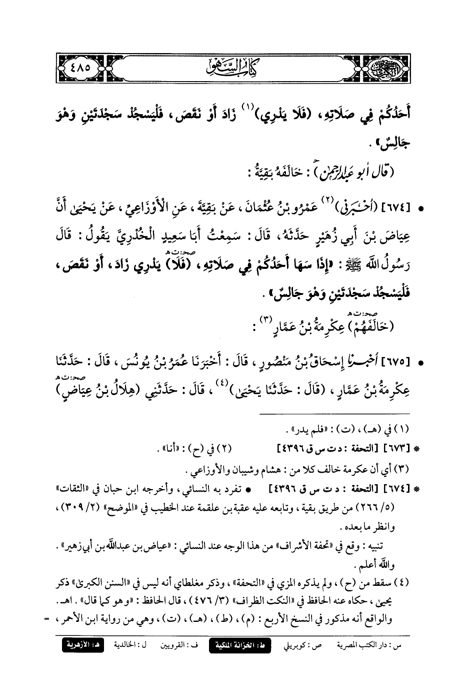 674- أَخبَرني عَمرُو بنُ عُثْمَانَ، عَن بَقِيَّةَ، عَنِ الأَوْزَاعِيِّ، عَن يَحيَى، أَنَّ عِيَاضَ بْنَ أَبي زُهَيْرٍ حَدَّثَهُ، قَالَ: سَمِعْتُ أَبَا سَعِيدٍ الخُدْرِيِّ يَقُولُ: قَالَ رَسُولُ اللهِ صَلى الله عَليه وسَلم: إِذَا سَهَا أَحَدُكُمْ فِي صَلاتِهِ فَلا يَدْرِي زَادَ أَوْ نَقَصَ، فَلْيَسْجُدْ سَجْدَتَيْنِ وَهُوَ جَالِسٌ.