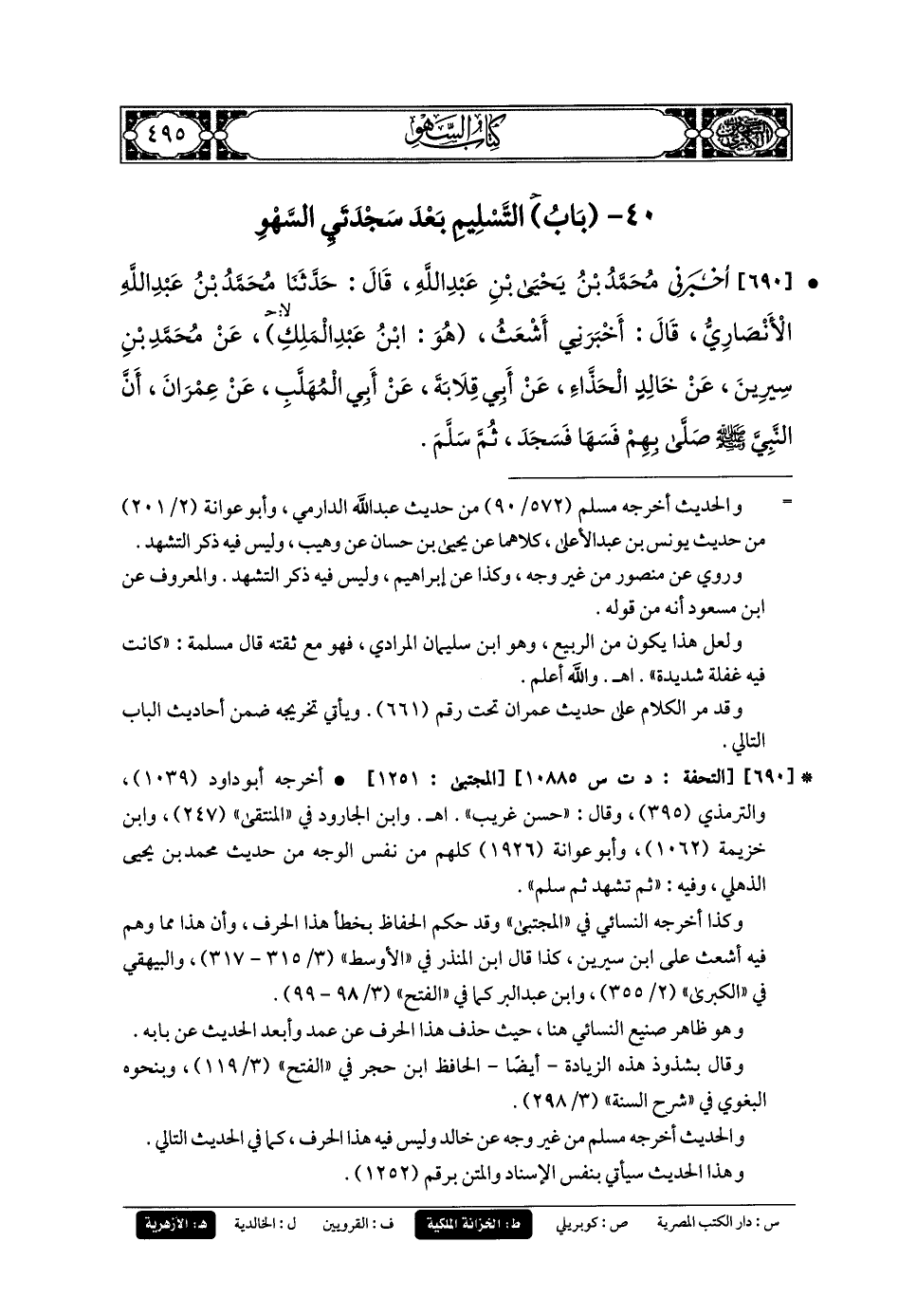 690- أَخبَرني مُحَمدُ بنُ يَحيَى بنِ عَبدِ اللهِ، قَالَ: حَدثنا مُحَمدُ بنُ عَبدِ اللهِ الأَنْصَارِيُّ، قَالَ: أَخبَرني أَشْعَثُ، هُوَ ابنُ عَبدِ المَلِكِ، عَن مُحَمدِ بنِ سِيرِينَ، عَن خَالِدٍ الحَذَّاءِ، عَن أَبي قِلابَةَ، عَن أَبي المُهَلَّبِ، عَن عِمْرَانَ، أَنَّ النَّبيَّ صَلى الله عَليه وسَلم صَلَّى بِهِمْ فَسَهَا فَسَجَدَ ثُمَّ سَلَّمَ.