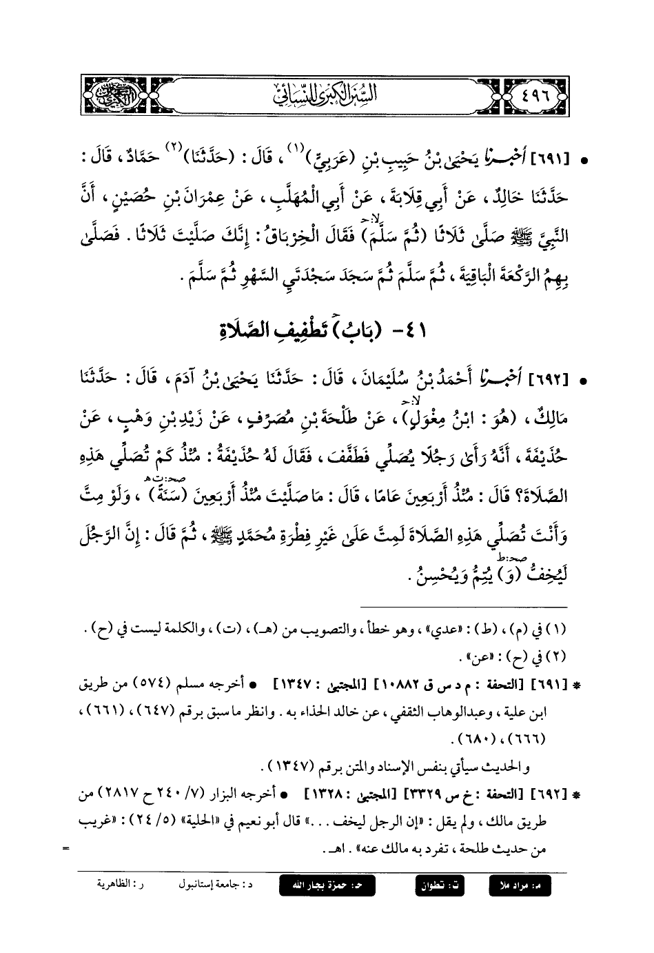 692- أَخبَرنا أَحْمَدُ بنُ سُلَيمَانَ، قَالَ: حَدثنا يَحيَى بنُ آدَمَ، قَالَ: حَدثنا مَالِكٌ، هُوَ ابنُ مِغْوَلٍ، عَن طَلحَةَ بنِ مُصَرِّفٍ، عَن زَيْدِ بنِ وَهْبٍ، عَن حُذَيْفَةَ، أَنَّهُ رَأَى رَجُلاً يُصَلِّي فَطَفَّفَ، فَقَالَ لَهُ حُذَيْفَةُ: مُنْذُ كَمْ تُصَلِّي هَذِهِ الصَّلاةَ؟ قَالَ: مُنْذُ أَرْبَعِينَ عَامًا، قَالَ: مَا صَلَّيْتَ مُنْذُ أَرْبَعِينَ سَنَةً، وَلَوْ مِتَّ وَأَنْتَ تُصَلِّي هَذِهِ الصَّلاةَ لَمِتَّ عَلَى غَيْرِ فِطْرَةِ مُحَمدٍ صَلى الله عَليه وسَلم، ثُمَّ قَالَ: إِنَّ الرَّجُلَ لَيُخِفُّ وَيُتِمُّ وَيُحْسِنُ.