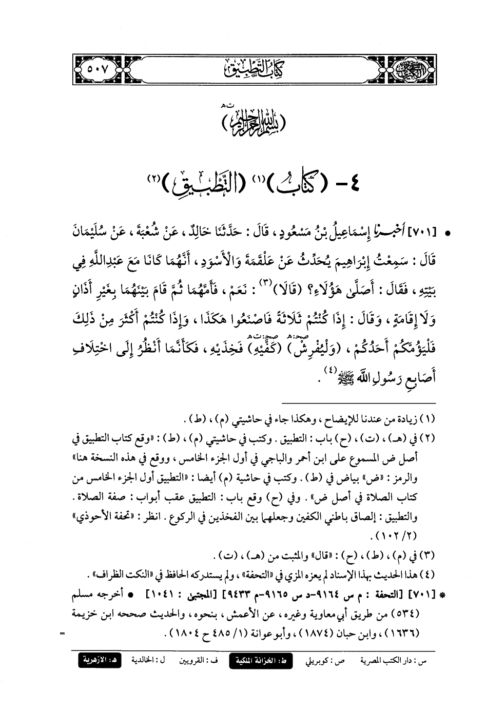 (1) قوله: «عَلَى» لم يرد في طبعة التأصيل، وفي طبعة الرسالة وضعه المحقق بين حاصرتين، وقال: مابين الحاصرتين سقط من النسخ الخطية، وأثبتناه من المجتبى و"تحفة الأَشراف».