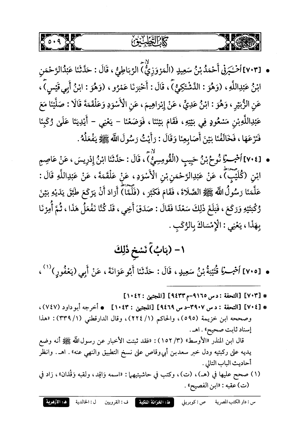 704- أَخبَرنا نُوحُ بنُ حَبِيبٍ القُومِسِيُّ، قَالَ: حَدثنا ابنُ إِدرِيسَ، عَن عَاصِمِ بنِ كُلَيْبٍ، عَن عَبدِ الرَّحمَنِ بنِ الأَسْوَدِ، عَن عَلْقَمَةَ، عَن عَبدِ اللهِ قَالَ: عَلَّمَنَا رَسُولُ اللهِ صَلى الله عَليه وسَلم الصَّلاةَ فَقَامَ فَكَبَّرَ، فَلَمَّا أَرَادَ أَنْ يَرْكَعَ طَبَّقَ يَدَيْهِ بَيْنَ رُكْبَتَيْهِ وَرَكَعَ، فَبَلَغَ ذَلِكَ سَعْدًا، فَقَالَ: صَدَقَ أَخِي، قَدْ كُنَّا نَفْعَلُ هَذَا، ثُمَّ أُمِرْنَا بِهَذَا، يَعْنِي الإِمْسَاكَ بِالرُّكَبِ.