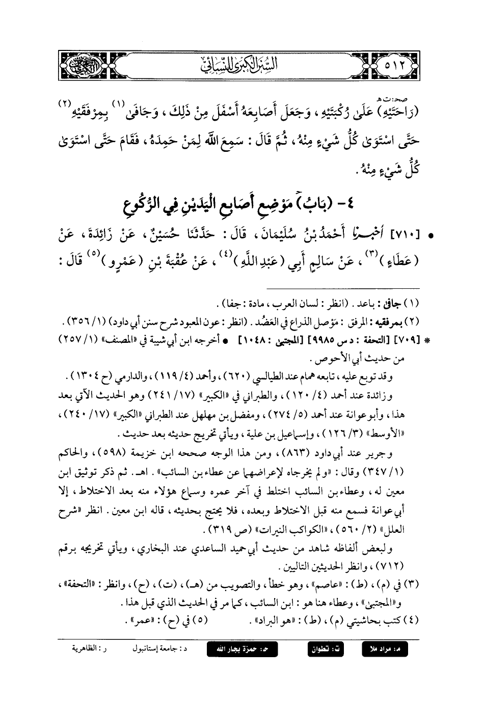 710- أَخبَرنا أَحْمَدُ بنُ سُلَيمَانَ، قَالَ: حَدثنا حُسَيْنٌ، عَن زَائِدَةَ، عَن عَطَاءٍ، عَن سَالِمٍ أَبي عَبدِ اللهِ، عَن عُقْبَةَ بنِ عَمْرٍو، قَالَ: أَلا أُصَلِّي كَمَا رَأَيْتُ رَسُولَ اللهِ صَلى الله عَليه وسَلم يُصَلِّي؟ فَقُلْنَا: بَلَى، فَقَامَ فَلَمَّا رَكَعَ وَضْعَ رَاحَتَيْهِ عَلَى رُكْبَتَيْهِ، وَجَعَلَ أَصَابِعَهُ مِنْ وَرَاءِ رُكْبَتَيْهِ، وَجَافَى إِبِطَيْهِ حَتَّى اسْتَقَرَّ كُلُّ شَيْءٍ مِنْهُ، ثُمَّ رَفَعَ رَأْسَهُ فَقَامَ حَتَّى اسْتَقَرَّ كُلُّ شَيْءٍ مِنْهُ، ثُمَّ سَجَدَ فَجَافَى إِبِطَيْهِ حَتَّى اسْتَقَرَّ كُلُّ شَيْءٍ مِنْهُ، ثُمَّ قَعَدَ حَتَّى اسْتَقَرَّ كُلُّ شَيْءٍ مِنْهُ، ثُمَّ صَنَعَ كَذَلِكَ أَرْبَعَ رَكَعَاتٍ، ثُمَّ قَالَ: هَكَذَا رَأَيْتُ رَسُولَ اللهِ صَلى الله عَليه وسَلم يُصَلِّي، وَهَكَذَا كَانَ يُصَلِّي بِنَا.