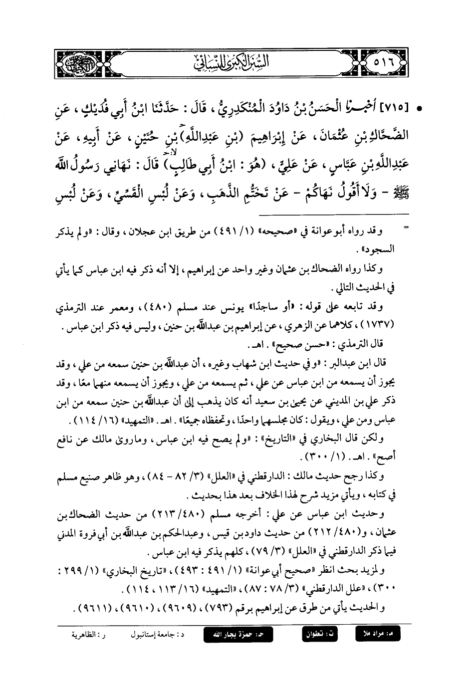 715- أَخبَرنا الحَسَنُ بنُ دَاوُدَ المُنْكَدِرِيُّ، قَالَ: حَدثنا ابنُ أَبي فُدَيْكٍ، عَنِ الضَّحَّاكِ بنِ عُثْمَانَ، عَن إِبرَاهِيمَ بنِ عَبدِ اللهِ بنِ حُنَيْنٍ، عَن أَبيهِ، عَن عَبدِ اللهِ بنِ عَبَّاسٍ، عَن عَليٍّ، هُوَ ابنُ أَبي طَالِبٍ قَالَ: نَهَانِي رَسُولُ اللهِ صَلى الله عَليه وسَلم، وَلا أَقُولُ نَهَاكُمْ عَن تَخَتُّمِ الذَّهَبِ، وَعَن لُبْسِ القَسِّيِّ، وَعَن لُبْسِ المُفْدَّمِ وَالمُعَصْفَرِ، وَعَنِ القِرَاءَةِ رَاكِعًا.