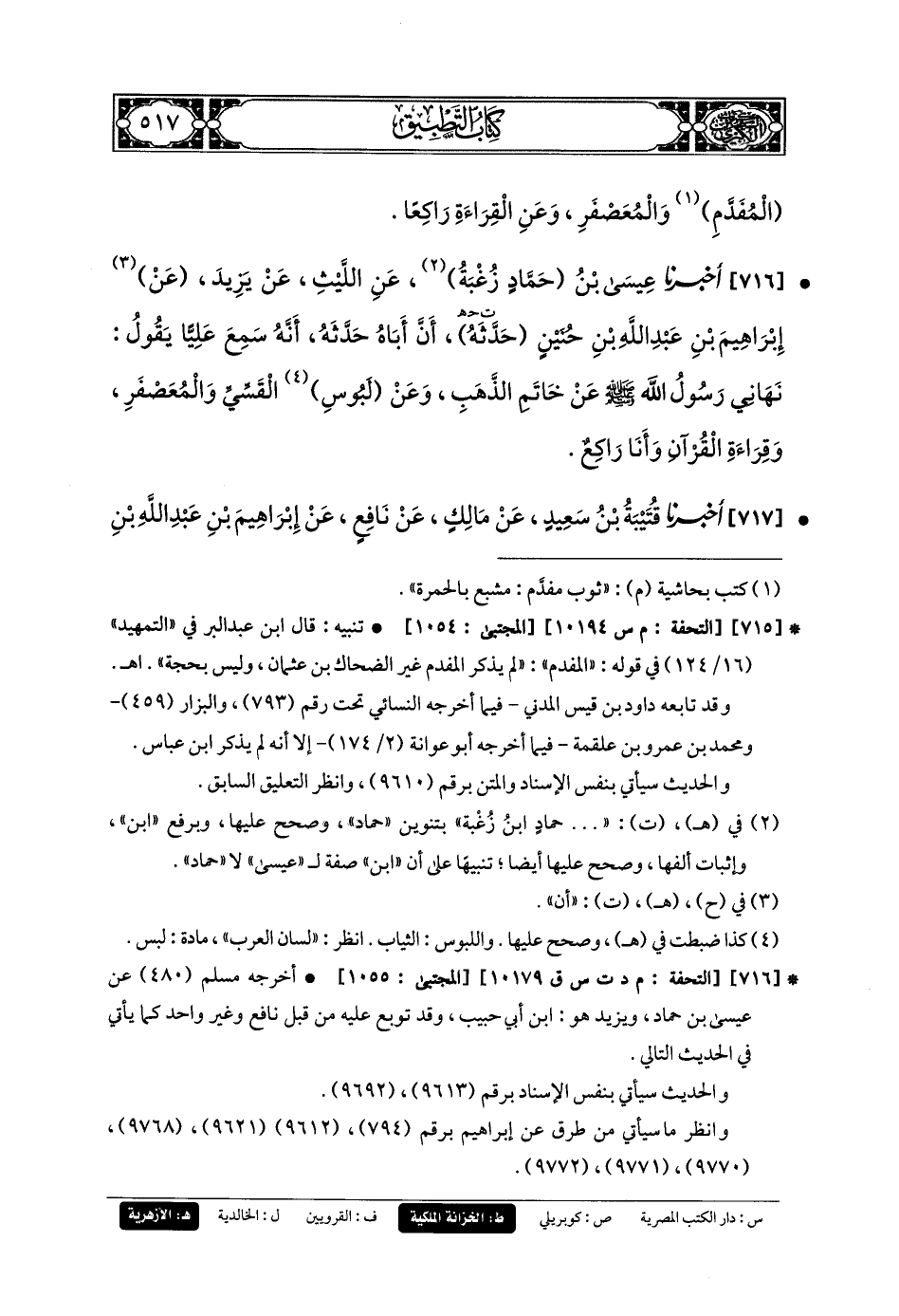 717- أَخبَرنا قُتَيبَةُ بنُ سَعِيدٍ، عَن مَالِكٍ، عَن نَافِعٍ، عَن إِبرَاهِيمَ بنِ عَبدِ اللهِ بنِ حُنَيْنٍ، عَن أَبيهِ، عَن عَليٍّ، قَالَ: نَهَانِي رَسُولُ اللهِ صَلى الله عَليه وسَلم عَن لُبِسِ القَسِّيِّ وَالمُعَصْفَرِ، وَعَن تَخَتُّمِ الذَّهَبِ، وَعَنِ القِرَاءَةِ فِي الرُّكُوعِ.