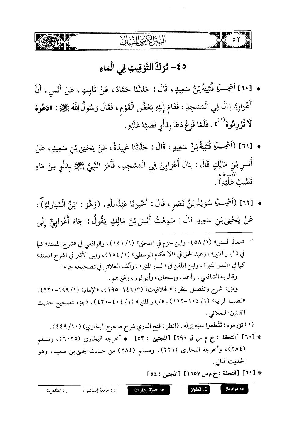 62- أَخبَرنا سُوَيْدُ بنُ نَصْرٍ، قَالَ: أَخبَرنا عَبدُ اللهِ، وَهُوَ ابنُ المُبَارَكِ، عَن يَحيَى بنِ سَعِيدٍ، قَالَ: سَمِعْتُ أَنَسَ بْنَ مَالِكٍ، يَقُولُ: جَاءَ أَعْرَابِيٌّ إِلَى المَسْجِدِ فَبَالَ فَصَاحَ بِهِ النَّاسُ، فَقَالَ رَسُولُ اللهِ صَلى الله عَليه وسَلم: اتْرُكُوهُ، فَتَرَكُوهُ حَتَّى بَالَ، ثُمَّ أَمْرَ بِدَلْوٍ مِنْ مَاءٍ فَصُبَّ عَلَيْهِ.