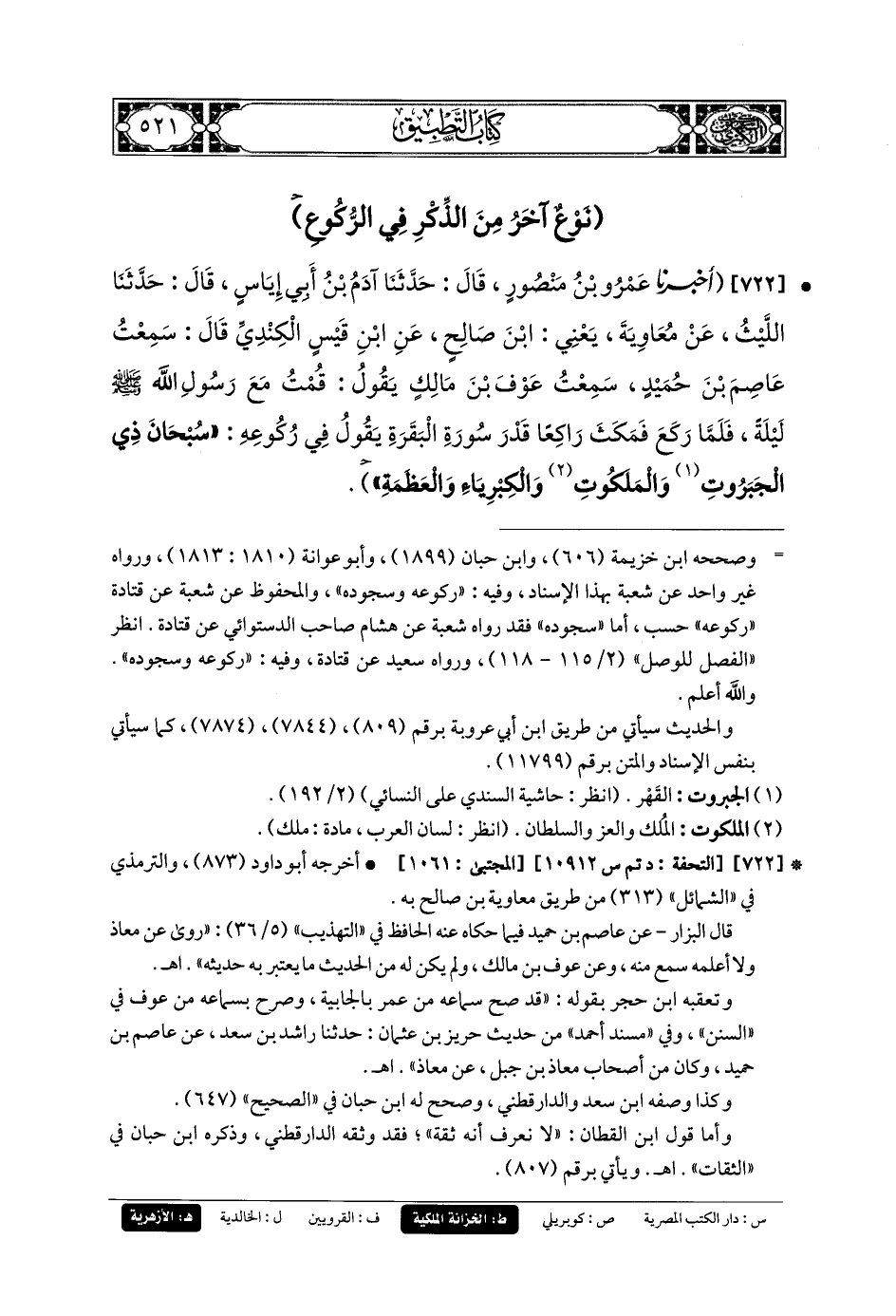722- أَخبَرَنا عَمرُو بنُ مَنصُورٍ، قال: حَدثنا آدَمُ بنُ أَبي إِيَاسٍ، قال: حَدثنا اللَّيْثُ، عَن مُعَاوِيَةَ، يَعْنِي ابنَ صَالِحٍ، عَنِ ابنِ قَيسٍ الكِنْدِيِّ، قَالَ: سَمِعْتُ عَاصِمَ بْنَ حُمَيْدٍ، سَمِعْتُ عَوْفَ بْنَ مَالِكٍ يَقُولُ: قُمْتُ مَعَ رَسُولِ اللهِ صَلى الله عَليهِ وسَلم لَيْلَةً، فَلَمَّا رَكَعَ فَمَكَثَ رَاكِعًا قَدْرَ سُورَةِ البَقَرَةِ يَقُولُ فِي رُكُوعِهِ: سُبْحَانَ ذِي الجَبَرُوتِ وَالمَلَكُوتِ وَالكِبْرِيَاءِ وَالعَظَمَةِ (1).