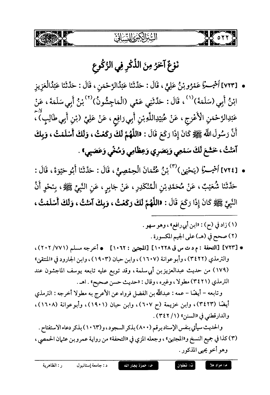 724- أَخبَرنا يَحيَى بنُ عُثْمَانَ الحِمْصِيُّ، قَالَ: حَدثنا أَبو حَيْوَةَ، قَالَ: حَدثنا شُعَيبٌ، عَن مُحَمدِ بنِ المُنْكَدِرِ، عَن جَابِرٍ، عَنِ النَّبيِّ صَلى الله عَليه وسَلم، بِنَحْوِ، أَنَّ النَّبيَّ صَلى الله عَليه وسَلم كَانَ إِذَا رَكَعَ قَالَ: اللهُمَّ لَكَ رَكَعْتُ، وَبِكَ آمَنْتُ، وَلَكَ أَسْلَمْتُ، وَعَلَيْكَ تَوَكَّلْتُ، أَنْتَ رَبِّي خَشَعَ سَمْعِي، وَبَصَرِي، وَدَمِي، وَلَحْمِي، وَعَظْمِي، وَعَصَبِي للهِ رَبِّ العَالَمِينَ.