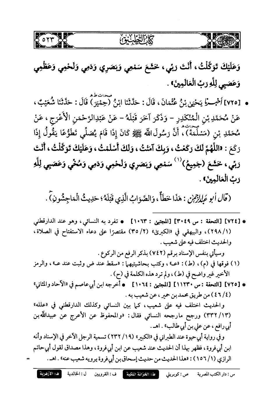 725- أَخبَرنا يَحيَى بنُ عُثْمَانَ، قَالَ: حَدثنا ابنُ حِمْيَرَ، قَالَ: حَدثنا شُعَيبٌ، عَن مُحَمدِ بنِ المُنْكَدِرِ، وَذَكَرَ آخَرُ قَبْلَهُ، عَن عَبدِ الرَّحمَنِ الأَعْرَجِ، عَن مُحَمدِ بنِ مَسْلَمَةَ، أَنَّ رَسُولَ اللهِ صَلى الله عَليه وسَلم كَانَ إِذَا قَامَ يُصَلِّي تَطَوُّعًا، يَقُولُ إِذَا رَكَعَ: اللهُمَّ لَكَ رَكَعْتُ، وَبِكَ آمَنْتُ، وَلَكَ أَسْلَمْتُ، وَعَلَيْكَ تَوَكَّلْتُ، أَنْتَ رَبِّي خَشَعَ جَمِيعُ سَمْعِي، وَبَصَرِي، وَلَحْمِي، وَدَمِي، وَمُخِّي، وَعَصَبِي للهِ رَبِّ العَالَمِينَ.
