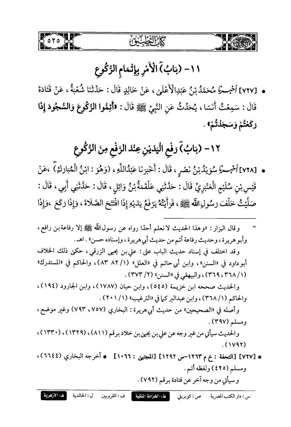 727- أَخبَرنا مُحَمدُ بنُ عَبدِ الأَعْلَى، عَن خَالِدٍ، قَالَ: حَدثنا شُعبَةُ، عَن قَتَادَةَ، قَالَ: سَمِعْتُ أَنَسًا يُحَدِّثُ عَنِ النَّبيِّ صَلى الله عَليه وسَلم قَالَ: أَتِمُّوا الرُّكُوعَ وَالسُّجُودَ إِذَا رَكَعْتُمْ وَسَجَدْتُمْ.