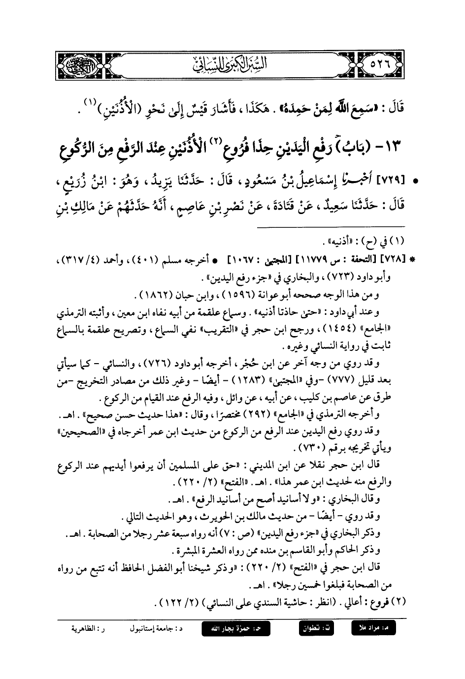 13- بَابُ رَفْعِ اليَدَيْنِ حِذَا فُرُوعِ الأُذُنَيْنِ عِنْدَ الرَّفْعِ مِنَ الرُّكُوعِ.