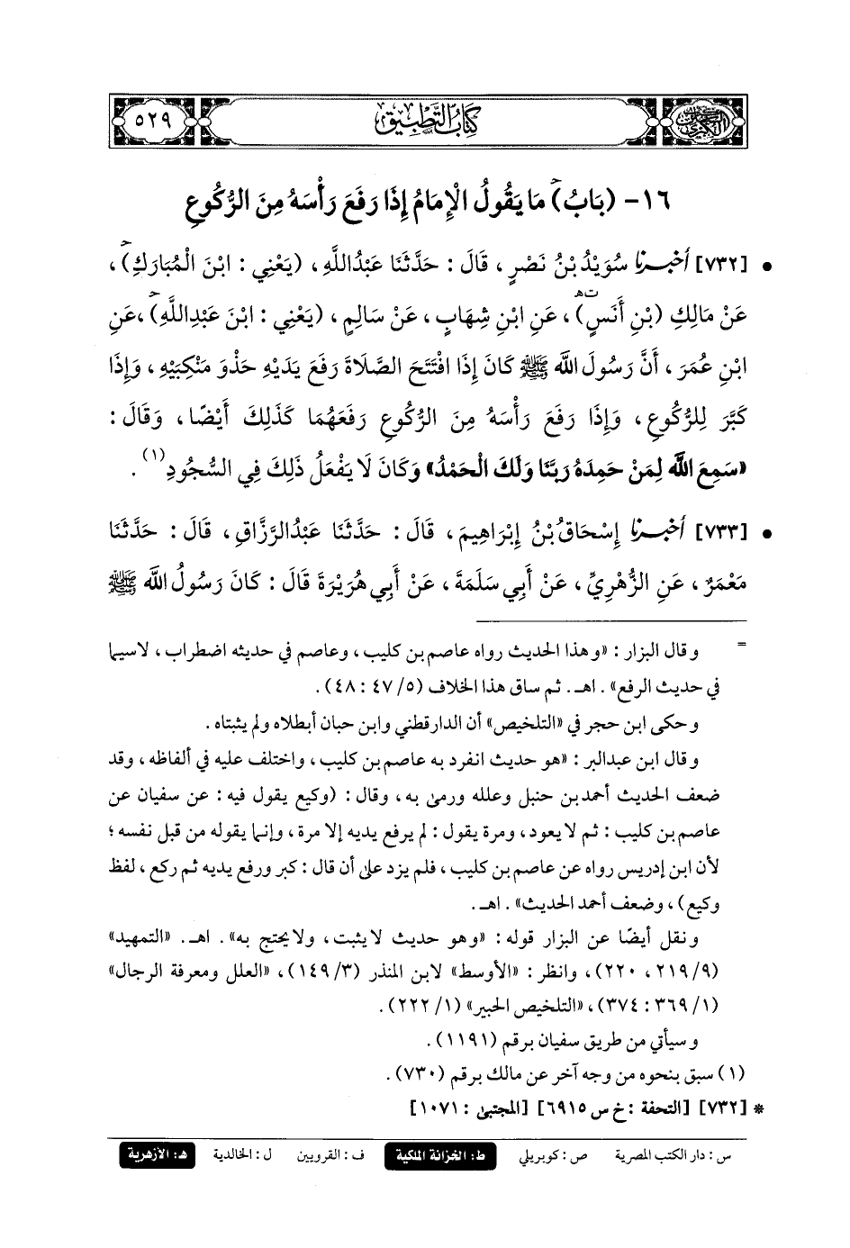 733- أَخبَرنا إِسحَاقُ بنُ إِبرَاهِيمَ، قَالَ: حَدثنا عَبدُ الرَّزَّاقِ، قَالَ: حَدثنا مَعْمَرٌ، عَنِ الزُّهْرِيِّ، عَن أَبي سَلَمَةَ، عَن أَبي هُرَيرَةَ قَالَ: كَانَ رَسُولُ اللهِ صَلى الله عَليه وسَلم إِذَا رَفَعَ رَأْسَهُ مِنَ الرَّكْعَةِ، قَالَ: اللهُمَّ رَبِّنَا وَلَكَ الحَمْدُ.