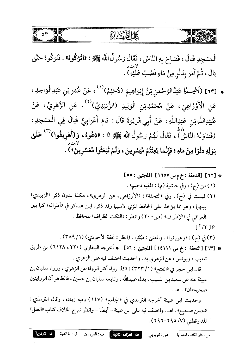 63- أَخبَرنا عَبدُ الرَّحمَنِ بنُ إِبرَاهِيمَ دُحَيْمٌ، عَن عُمَرَ بنِ عَبدِ الوَاحِدِ، عَنِ الأَوْزَاعِيِّ، عَن مُحَمدِ بنِ الوَلِيدِ الزُّبَيْدِيِّ، عَنِ الزُّهْرِيِّ، عَن عُبَيدِ اللهِ بنِ عَبدِ اللهِ، عَن أَبي هُرَيرَةَ، قَالَ: قَامَ أَعْرَابِيٌّ فَبَالَ فِي المَسْجِدِ فَتَنَاوَلَهُ النَّاسُ، فَقَالَ لَهُمْ رَسُولُ اللهِ صَلى الله عَليه وسَلم: دَعُوهُ وَأَهْرِيقُوا عَلَى بَوْلِهِ دَلْوًا مِنْ مَاءٍ، فَإِنَّمَا بُعِثْتُمْ مُيَسِّرِينَ وَلَمْ تُبْعَثُوا مُعَسِّرِينَ.