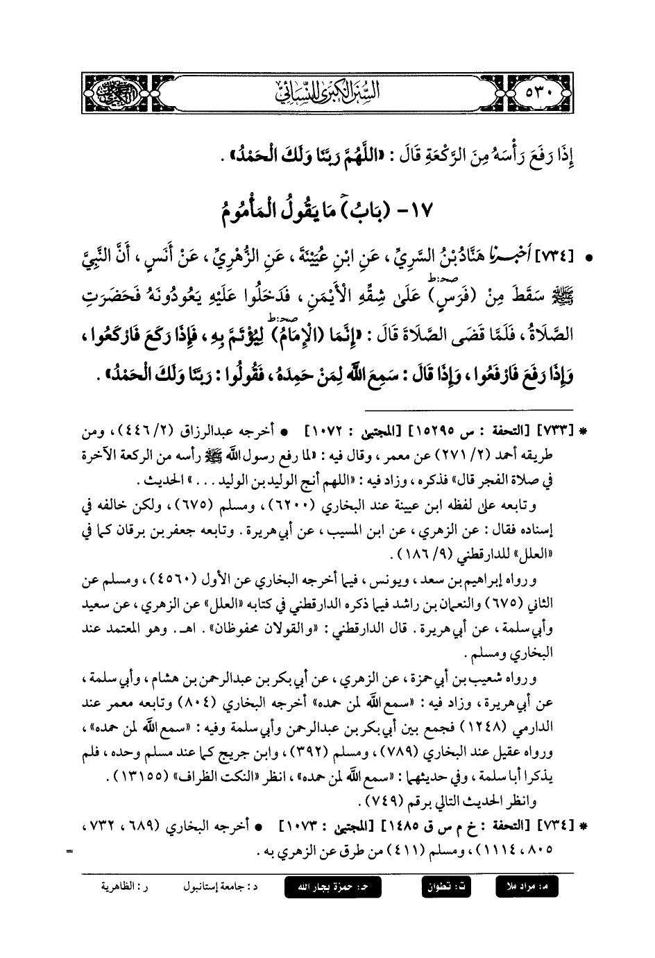 734- أَخبَرنا هَنَّادُ بنُ السَّرِيِّ، عَنِ ابنِ عُيَيْنَةَ، عَنِ الزُّهْرِيِّ، عَن أَنَسٍ، أَنَّ النَّبيَّ صَلى الله عَليه وسَلم سَقَطَ مِنْ فَرَسٍ عَلَى شِقِّهِ الأَيْمَنِ فَدَخَلُوا عَلَيْهِ يَعُودُونَهُ فَحَضَرَتِ الصَّلاةُ، فَلَمَّا قَضَى الصَّلاةَ، قَالَ: إِنَّمَا الإِمَامُ لِيُؤْتَمَّ بِهِ، فَإِذَا رَكَعَ فَارْكَعُوا، وَإِذَا رَفَعَ فَارْفَعُوا، وَإِذَا قَالَ: سَمِعَ اللهُ لِمَنْ حَمِدَهُ، فَقُولُوا: رَبَّنَا وَلَكَ الحَمْدُ.