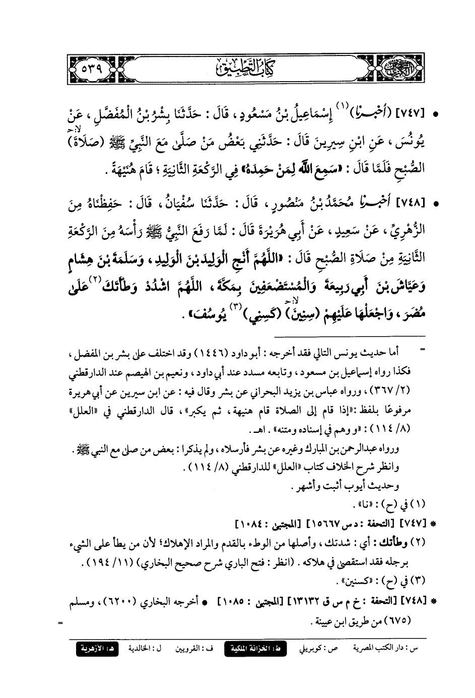 748- أَخبَرنا مُحَمدُ بنُ مَنصُورٍ، قَالَ: حَدثنا سُفيانُ قَالَ: حَفِظْنَاهُ مِنَ الزُّهْرِيِّ، عَن سَعِيدٍ، عَن أَبي هُرَيرَةَ، قَالَ: لَمَّا رَفَعَ النَّبيُّ صَلى الله عَليه وسَلم، رَأْسَهُ مِنَ الرَّكْعَةِ الثَّانِيَةِ مِنْ صَلاةِ الصُّبْحِ، قَالَ: اللهُمَّ أَنْجِ الوَلِيدَ بْنَ الوَلِيدِ، وَسَلَمَةَ بْنَ هِشَامٍ، وَعَيَّاشَ بْنَ أَبي رَبِيعَةَ، وَالمُسْتَضْعَفِينَ بِمَكَّةَ، اللهُمَّ اشْدُدْ وَطْأَتَكَ عَلَى مُضَرَ، وَاجْعَلْهَا عَلَيْهِمْ سِنِينَ كَسِنِي يُوسُفَ.