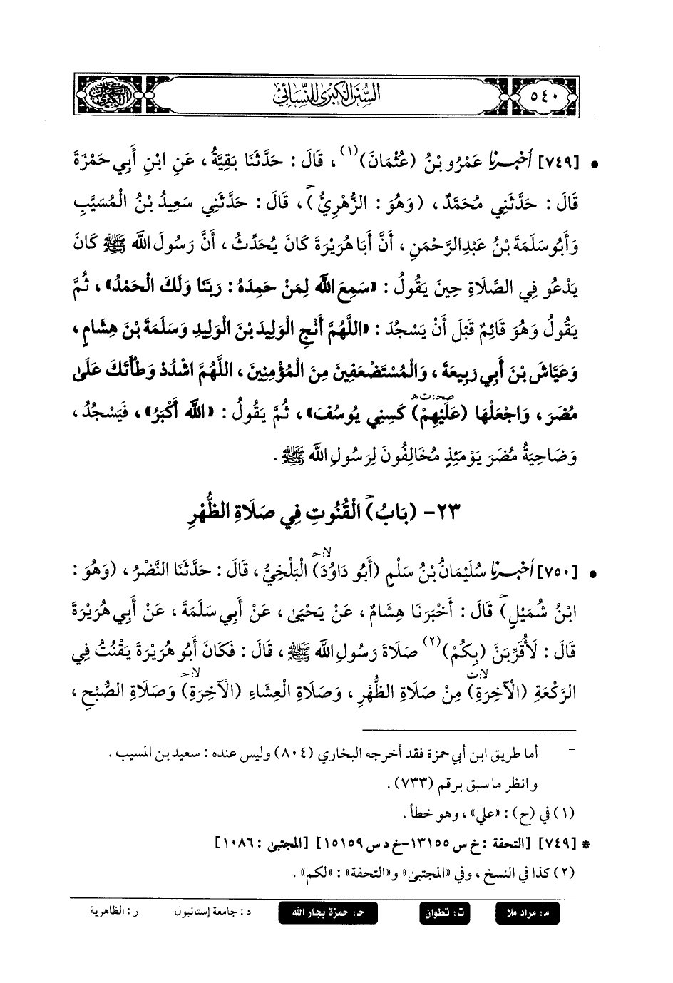 749- أَخبَرنا عَمرُو بنُ عُثْمَانَ، قَالَ: حَدثنا بَقِيَّةُ، عَنِ ابنِ أَبي حَمْزَةَ، قَالَ: حَدَّثني مُحَمدٌ وَهُوَ الزُّهْرِيُّ، قَالَ: حَدَّثني سَعِيدُ بنُ المُسَيَّبِ، وَأَبو سَلَمَةَ بنِ عَبدِ الرَّحمَنِ، أَنَّ أَبَا هُرَيرَةَ كَانَ يُحَدِّثُ، أَنَّ رَسُولَ اللهِ صَلى الله عَليه وسَلم كَانَ يَدْعُو فِي الصَّلاةِ حِينَ يَقُولُ: سَمِعَ اللهُ لِمَنْ حَمِدَهُ، رَبِّنَا وَلَكَ الحَمْدُ، ثُمَّ يَقُولُ وَهُوَ قَائِمٌ قَبْلَ أَنْ يَسْجُدَ: اللهُمَّ أَنْجِ الوَلِيدَ بْنَ الوَلِيدِ، وَسَلَمَةَ بْنَ هِشَامٍ، وَعَيَّاشَ بْنَ أَبي رَبِيعَةَ، وَالمُسْتَضْعَفِينَ مِنَ المُؤْمِنِينَ، اللهُمَّ اشْدُدْ وَطْأَتَكَ عَلَى مُضَرَ، وَاجْعَلْهَا عَلَيْهِمْ كَسِنِي يُوسُفَ، ثُمَّ يَقُولُ: اللهُ أَكْبَرُ، فَيَسْجُدُ وَضَاحِيَةُ مُضَرَ يَوْمَئِذٍ مُخَالِفُونَ لِرَسُولِ اللهِ صَلى الله عَليه وسَلم.