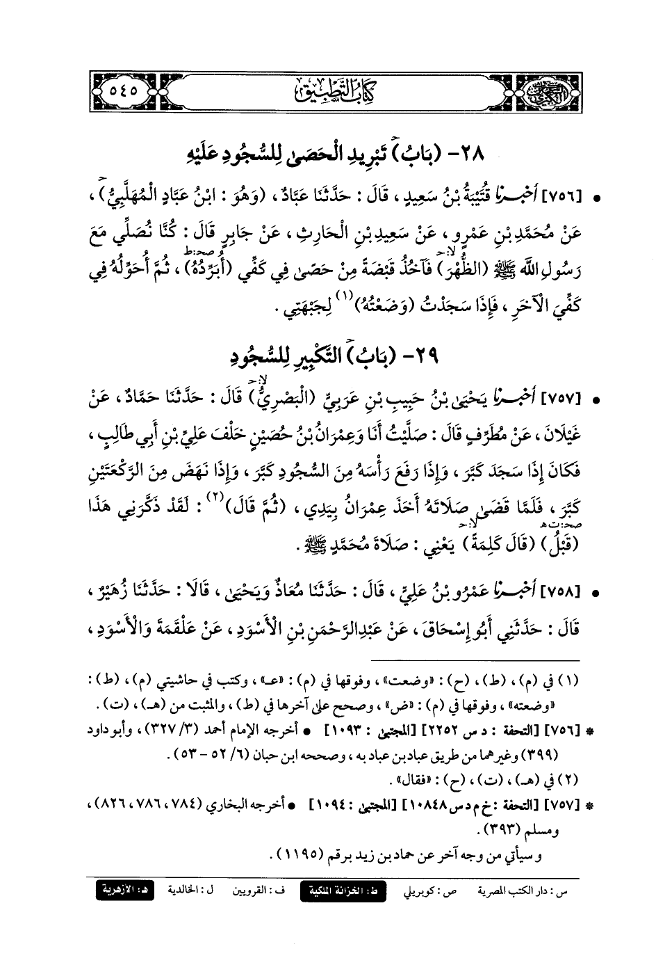 756- أَخبَرنا قُتَيبَةُ بنُ سَعِيدٍ، قَالَ: حَدثنا عَبَّادٌ وَهُوَ ابنُ عَبَّادٍ المُهَلَّبِيُّ، عَن مُحَمدِ بنِ عَمْرٍو، عَن سَعِيدِ بنِ الحَارِثِ، عَن جَابِرٍ، قَالَ: كُنَّا نُصَلِّي مَعَ رَسُولِ اللهِ صَلى الله عَليه وسَلم، الظُّهْرَ، فَآخُذُ قَبْضَةً مِنْ حَصًى فِي كَفِّي أُبَرِّدُهُ، ثُمَّ أُحَوِّلُهُ فِي كَفِّي الآخَرَ، فَإِذَا سَجَدْتُ وَضَعْتُهُ لِجَبْهَتِي.
