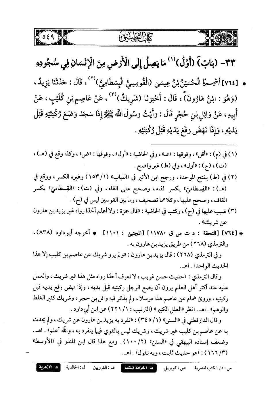 764- أَخبَرنا الحُسَيْنُ بنُ عِيسَى القُومَسِيُّ البِسْطَامِيُّ، قَالَ: حَدثنا يَزِيدُ وَهُوَ ابنُ هَارُونَ، قَالَ: أَخبَرنا شَرِيكٌ، عَن عَاصِمِ بنِ كُلَيْبٍ، عَن أَبيهِ، عَن وَائِلِ بنِ حُجْرٍ، قَالَ: رَأَيْتُ رَسُولَ اللهِ صَلى الله عَليه وسَلم إِذَا سَجَدَ وَضْعَ رُكْبَتَيْهِ قَبْلَ يَدَيْهِ، وَإِذَا نَهَضَ رَفَعَ يَدَيْهِ قَبْلَ رُكْبَتَيْهِ.
