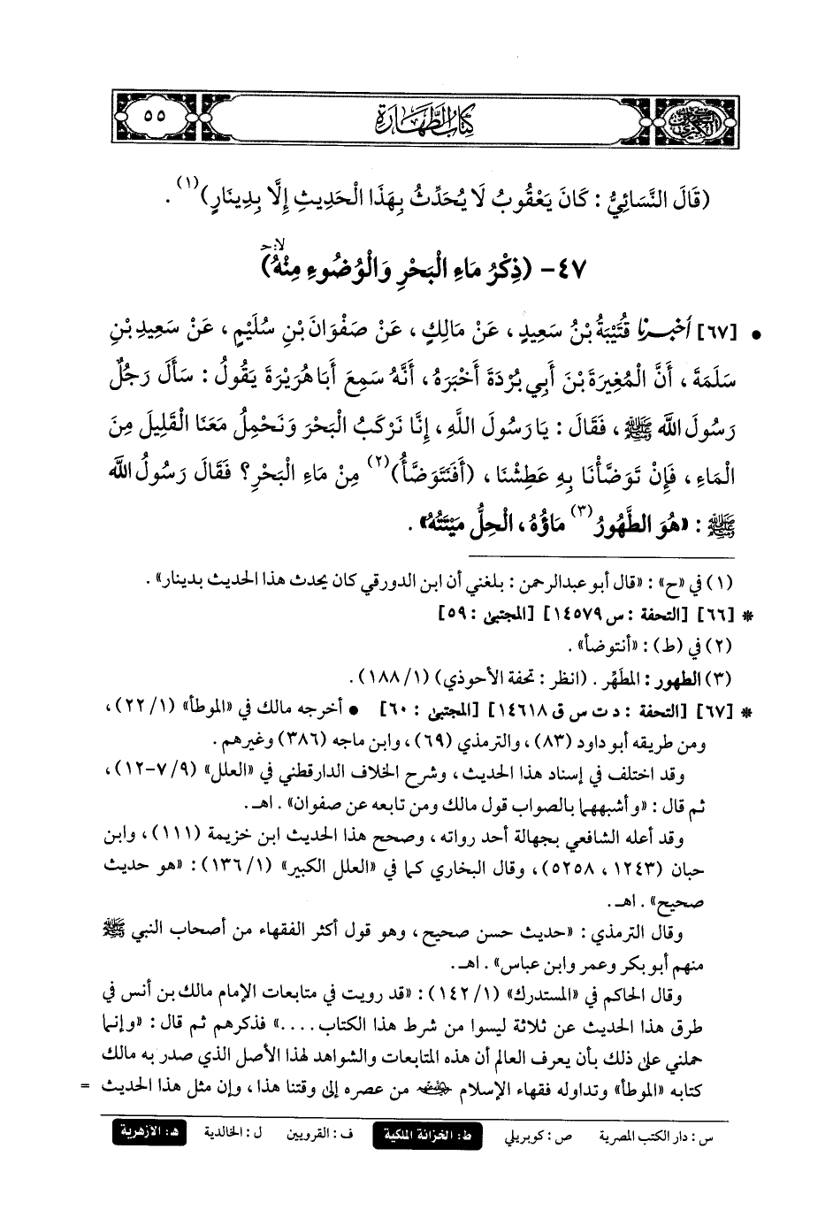 67- أَخبَرنا قُتَيبَةُ بنُ سَعِيدٍ، عَن مَالِكٍ، عَن صَفْوَانَ بنِ سُلَيْمٍ، عَن سَعِيدِ بنِ سَلَمَةَ، أَنَّ المُغِيرَةَ بْنَ أَبي بُرْدَةَ أَخبَرَهُ، أَنَّهُ سَمِعَ أَبَا هُرَيرَةَ، يَقُولُ: سَأَلَ رَجُلٌ رَسُولَ اللهِ صَلى الله عَليه وسَلم، فَقَالَ: يَا رَسُولَ اللهِ، إِنَّا نَرْكَبُ البَحْرَ وَنَحْمِلُ مَعَنَا القَلِيلَ مِنَ المَاءِ، فَإِنْ تَوَضَّأْنَا بِهِ عَطِشْنَا، أَفَنَتَوَضَّأُ مِنْ مَاءِ البَحْرِ؟ فَقَالَ رَسُولُ اللهِ صَلى الله عَليه وسَلم: هُوَ الطَّهُورُ مَاؤُهُ الحِلُّ مَيْتَتُهُ.
