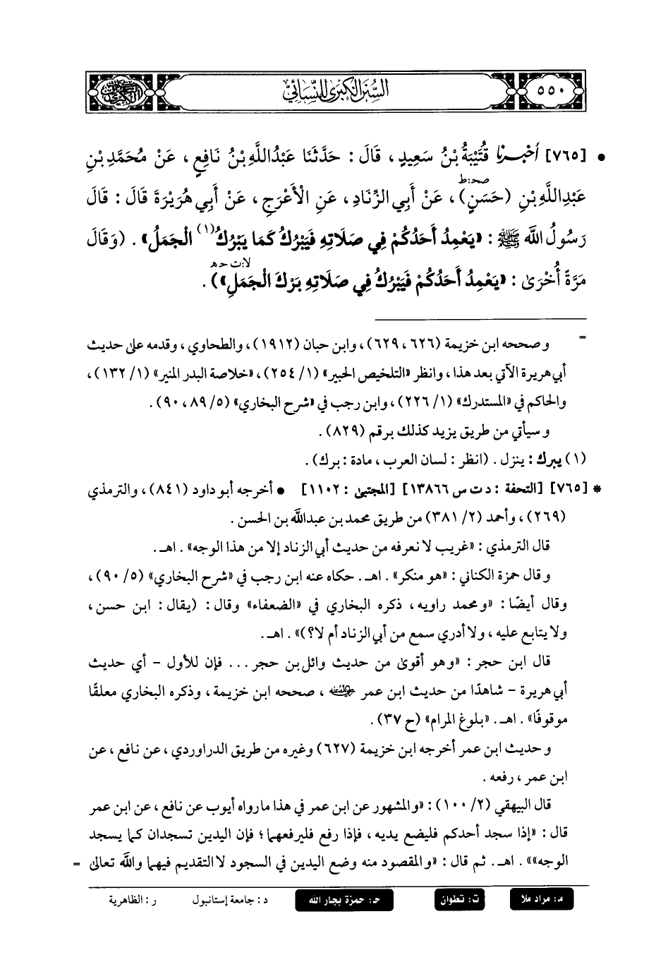 765- أَخبَرنا قُتَيبَةُ بنُ سَعِيدٍ، قَالَ: حَدثنا عَبدُ اللهِ بنُ نَافِعٍ، عَن مُحَمدِ بنِ عَبدِ اللهِ بنِ حَسَنٍ، عَن أَبي الزِّنَادِ، عَنِ الأَعْرَجِ، عَن أَبي هُرَيرَةَ، قَالَ: قال رَسُولُ اللهِ صَلى الله عَليه وسَلم: يَعْمِدُ أَحَدُكُمْ فِي صَلاتِهِ فَيَبْرُكُ كَمَا يَبْرُكُ الجَمَلُ، وَقَالَ مَرَّةً أُخْرَى: يَعْمِدُ أَحَدُكُمْ، فَيَبْرُكُ فِي صَلاتِهِ بَرْكَ الجَمَلِ.