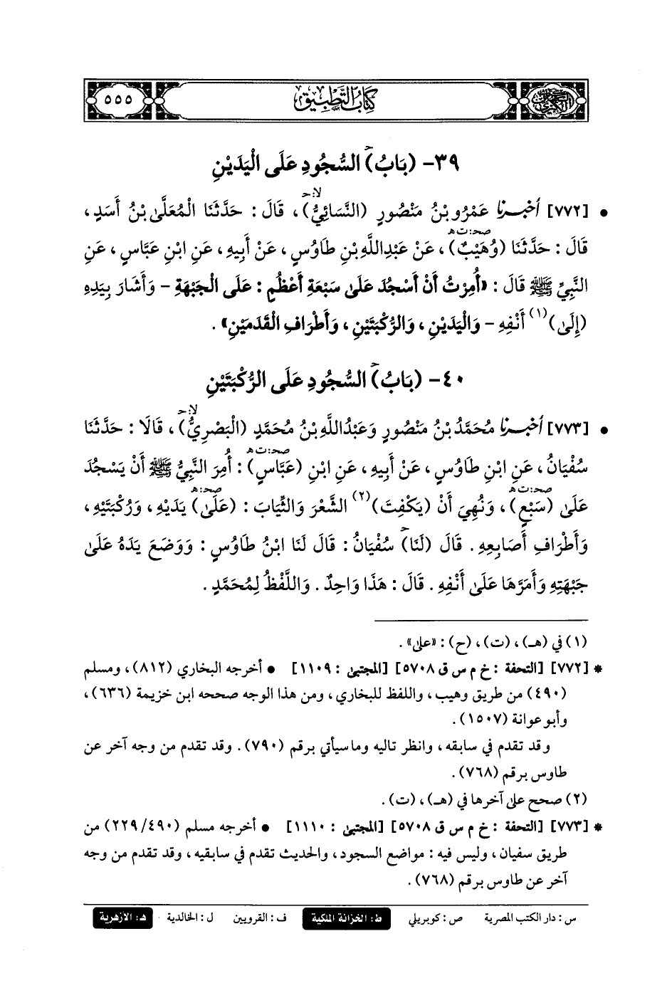 772- أَخبَرنا عَمرُو بنُ مَنصُورٍ النَّسَائِيُّ، قَالَ: حَدثنا المُعَلَّى بنُ أَسَدٍ، قَالَ: حَدثنا وُهَيْبٌ، عَن عَبدِ اللهِ بنِ طَاوُوسٍ، عَن أَبيهِ، عَنِ ابنِ عَبَّاسٍ، عَنِ النَّبيِّ صَلى الله عَليه وسَلم، قَالَ: أُمِرْتُ أَنْ أَسْجُدَ عَلَى سَبْعَةِ أَعْظُمٍ عَلَى الجَبْهَةِ، وَأَشَارَ بِيَدِهِ إلَى أَنْفِهِ، وَاليَدَيْنِ، وَالرُّكْبَتَيْنِ، وَأَطْرَافِ القَدَمَيْنِ.
