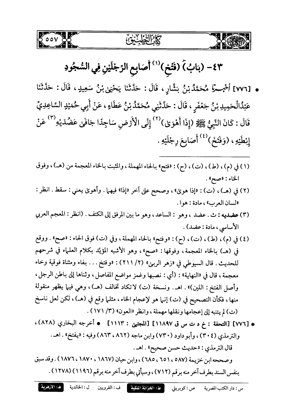 776- أَخبَرنا مُحَمدُ بنُ بَشَّارٍ، قَالَ: حَدثنا يَحيَى بنُ سَعِيدٍ، قَالَ: حَدثنا عَبدُ الحَمِيدِ بنُ جَعفَرٍ، قَالَ: حَدَّثني مُحَمدُ بنُ عَطَاءٍ، عَن أَبي حُمَيْدٍ السَّاعِدِيِّ، قَالَ: كَانَ النَّبيُّ صَلى الله عَليه وسَلم، إِذَا أَهَوَى إِلَى الأَرْضِ سَاجِدًا جَافَى عَضُدَيْهِ عَن إِبِطَيْهِ، وَفَتَخَ أَصَابِعَ رِجْلَيْهِ.