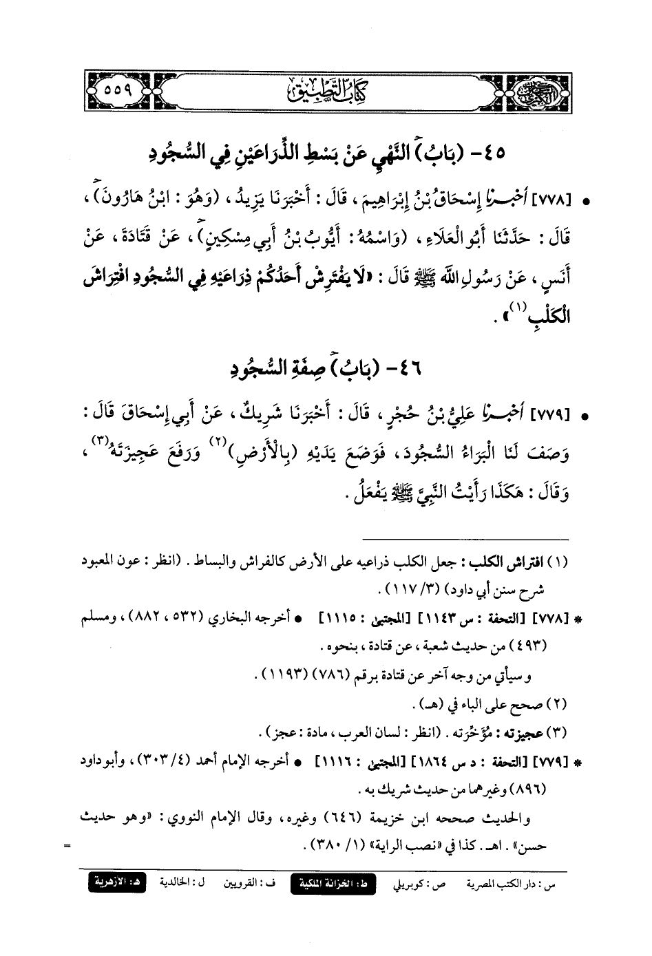 779- أَخبَرنا عَليُّ بنُ حُجْرٍ، قَالَ: أَخبَرنا شَرِيكٌ، عَن أَبي إِسحَاقَ، قَالَ: وَصَفَ لَنَا البَرَاءُ السُّجُودَ فَوَضَعَ يَدَيْهِ بِالأَرْضِ، وَرَفَعَ عَجِيزَتَهُ وَقَالَ: هَكَذَا رَأَيْتُ النَّبيَّ صَلى الله عَليه وسَلم يَفْعَلُ.