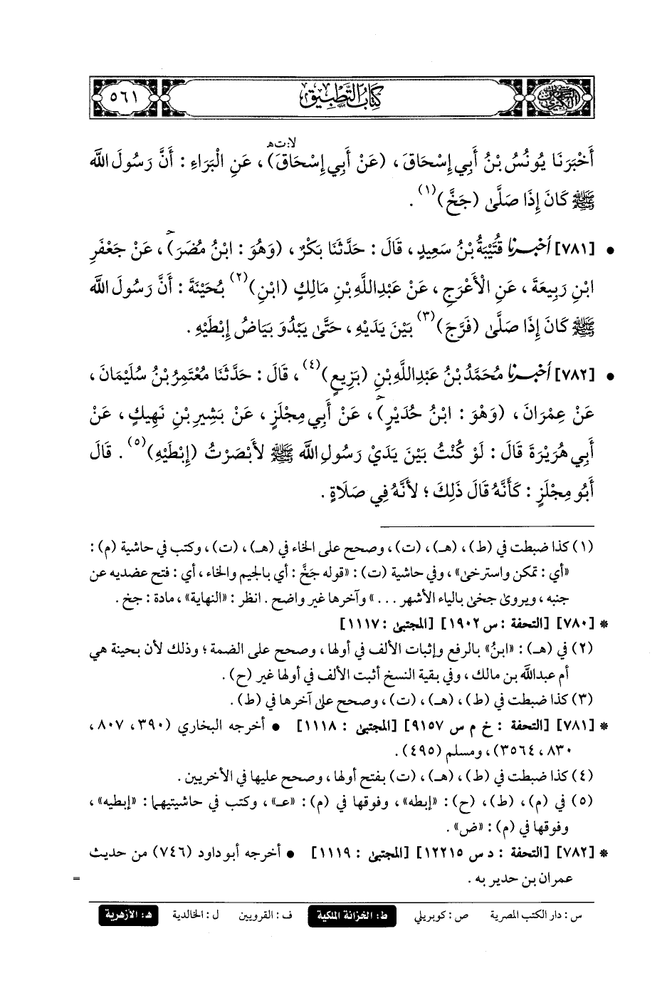 781- أَخبَرنا قُتَيبَةُ بنُ سَعِيدٍ، قَالَ: حَدثنا بَكْرٌ وَهُوَ ابنُ مُضَرَ، عَن جَعفَرِ بنِ رَبِيعَةَ، عَنِ الأَعْرَجِ، عَن عَبدِ اللهِ بنِ مَالِكٍ ابنِ بُحَيْنَةَ، أَنَّ رَسُولَ اللهِ صَلى الله عَليه وسَلم كَانَ إِذَا صَلَّى فَرَّجَ بَيْنَ يَدَيْهِ حَتَّى يَبْدُوَ بَيَاضَ إِبِطَيْهِ.