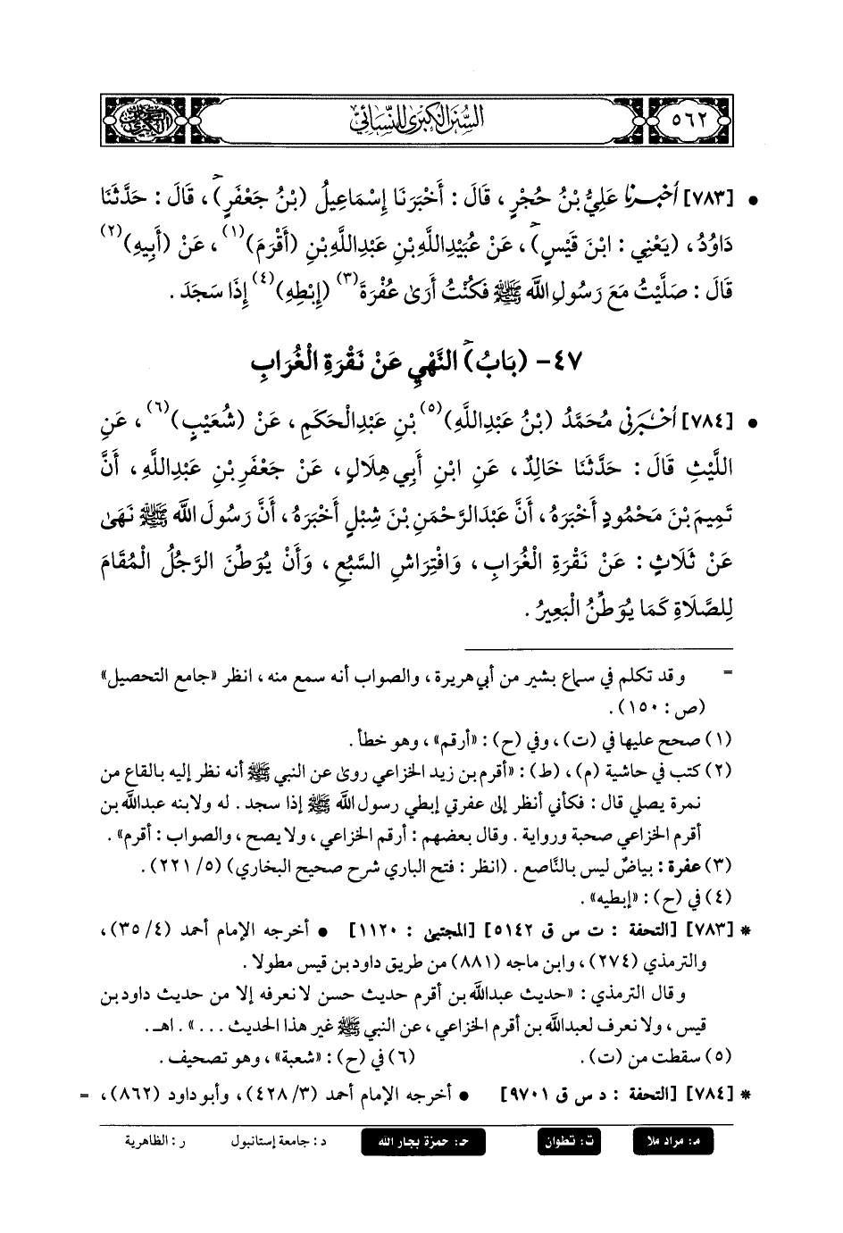 784- أَخبَرني مُحَمدُ بنُ عَبدِ اللهِ بنِ عَبدِ الحَكَمِ، عَن شُعَيبٍ، عَنِ اللَّيْثِ، قَالَ: حَدثنا خَالِدٌ، عَنِ ابنِ أَبي هِلالٍ، عَن جَعفَرِ بنِ عَبدِ اللهِ، أَنَّ تَمِيمَ بْنَ مَحْمُودٍ أَخبَرَهُ؛ أَنَّ عَبدَ الرَّحمَنِ بْنَ شِبْلٍ أَخبَرَهُ؛ أَنَّ رَسُولَ اللهِ صَلى الله عَليه وسَلم نَهَى عَن ثَلاثٍ: عَن نَقْرَةِ الغُرَابِ، وَافْتِرَاشِ السَّبُعِ، وَأَنْ يُوَطِّنَ الرَّجُلُ المَقَامَ لِلصَّلاةِ كَمَا يُوَطِّنُ البَعِيرُ.