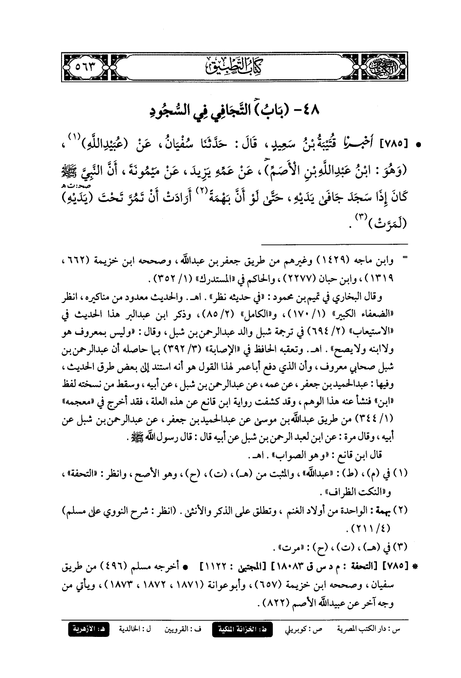 785- أَخبَرنا قُتَيبَةُ بنُ سَعِيدٍ، قَالَ: حَدثنا سُفيانُ، عَن عُبَيدِ اللهِ وَهُوَ ابنُ عَبدِ اللهِ بنِ الأَصَمِّ، عَن عَمِّهِ يَزِيدَ، عَن مَيْمُونَةَ، أَنَّ النَّبيَّ صَلى الله عَليه وسَلم كَانَ إِذَا سَجَدَ جَافَى يَدَيْهِ حَتَّى لَوْ أَنَّ بَهْمَةً أَرَادَتْ أَنْ تَمُرَّ تَحْتَ يَدَيْهِ لَمَرَّتْ.