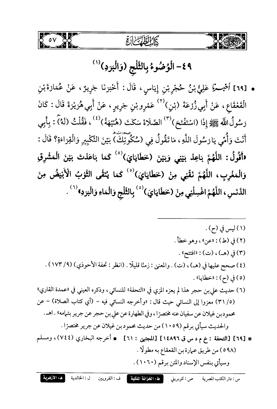 69- أَخبَرنا عَليُّ بنُ حُجْرِ بنِ إِيَاسٍ، قَالَ: أَخبَرنا جَرِيرٌ، عَن عُمَارَةَ بنِ القَعْقَاعِ، عَن أَبي زُرْعَةَ بنِ عَمْرِو بنِ جَرِيرٍ، عَن أَبي هُرَيرَةَ، قَالَ: كَانَ رَسُولُ اللهِ صَلى الله عَليه وسَلم إِذَا اسْتَفْتَحَ الصَّلاةَ سَكَتَ هُنَيْهَةً، فَقُلْتُ لَهُ: بِأَبي أَنْتَ وَأُمِّي يَا رَسُولَ اللهِ، مَا تَقُولُ فِي سُكُوتِكَ بَيْنَ التَّكْبِيرِ وَالقِرَاءَةِ؟ قَالَ: أَقُولُ: اللهُمَّ بَاعِدْ بَيْنِي وَبَيْنَ خَطَايَايَ كَمَا بَاعَدْتَ بَيْنَ المَشْرِقِ وَالمَغْرِبِ، اللهُمَّ نَقِّنِي مِنْ خَطَايَايَ كَمَا يُنَقَّى الثَّوْبُ الأَبْيَضُ مِنَ الدَّنَسِ، اللهُمُ اغْسِلْنِي مِنْ خَطَايَايَ بِالثَّلْجِ وَالمَاءِ وَالبَرَدِ.