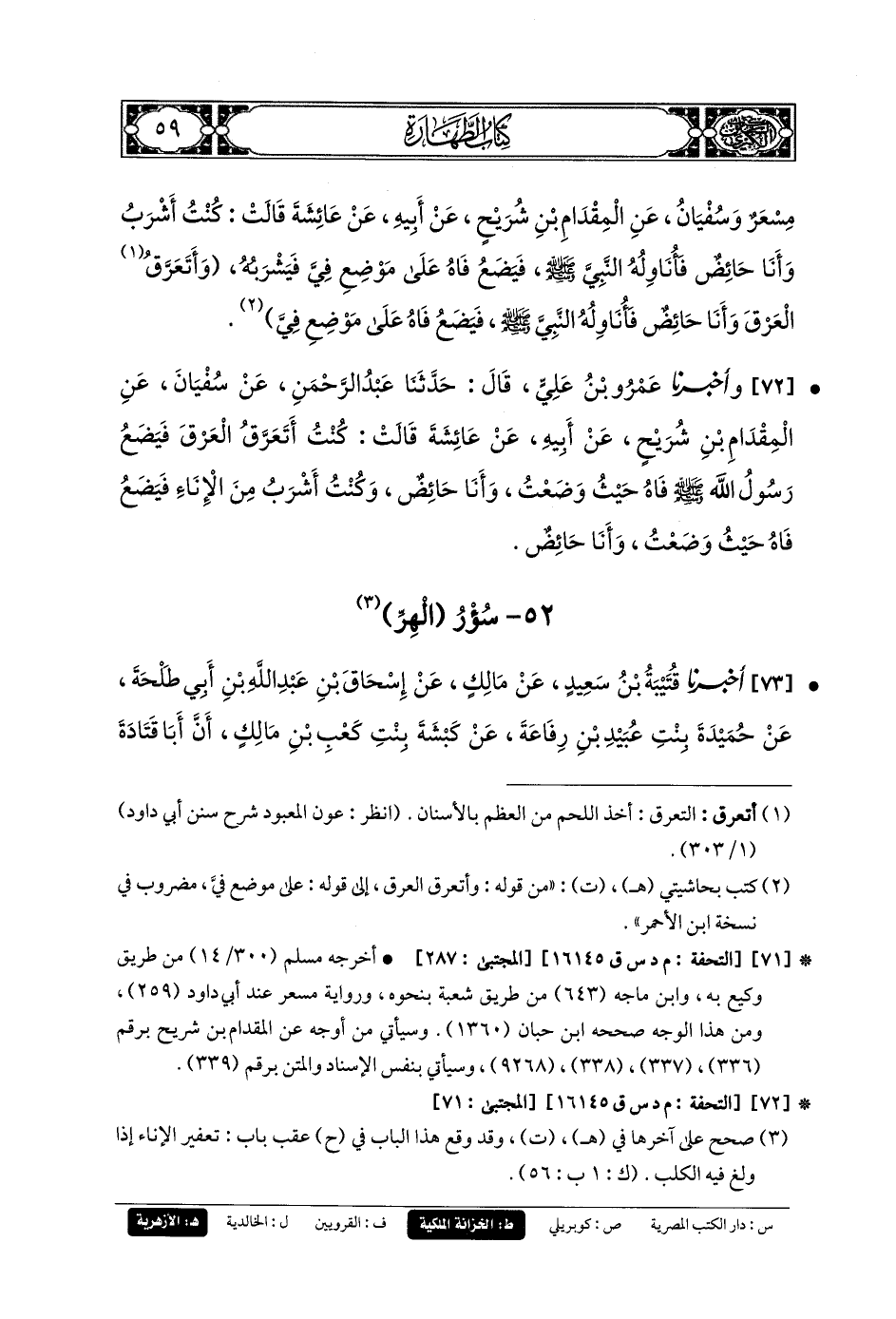 72- وَأَخبَرنا عَمرُو بنُ عَليٍّ، قَالَ: حَدثنا عَبدُ الرَّحمَنِ، عَن سُفيانَ، عَنِ المِقْدَامِ بنِ شُرَيْحٍ، عَن أَبيهِ، عَن عَائِشَةَ، قَالَتْ: كُنْتُ أَتَعَرَّقُ العَرْقَ فَيَضَعُ رَسُولُ اللهِ صَلى الله عَليه وسَلم فَاهُ حَيْثُ وَضَعْتُ، وَأَنَا حَائِضٌ، وَكُنْتُ أَشْرَبُ مِنَ الإِنَاءِ فَيَضَعُ فَاهُ حَيْثُ وَضَعْتُ، وَأَنَا حَائِضٌ.