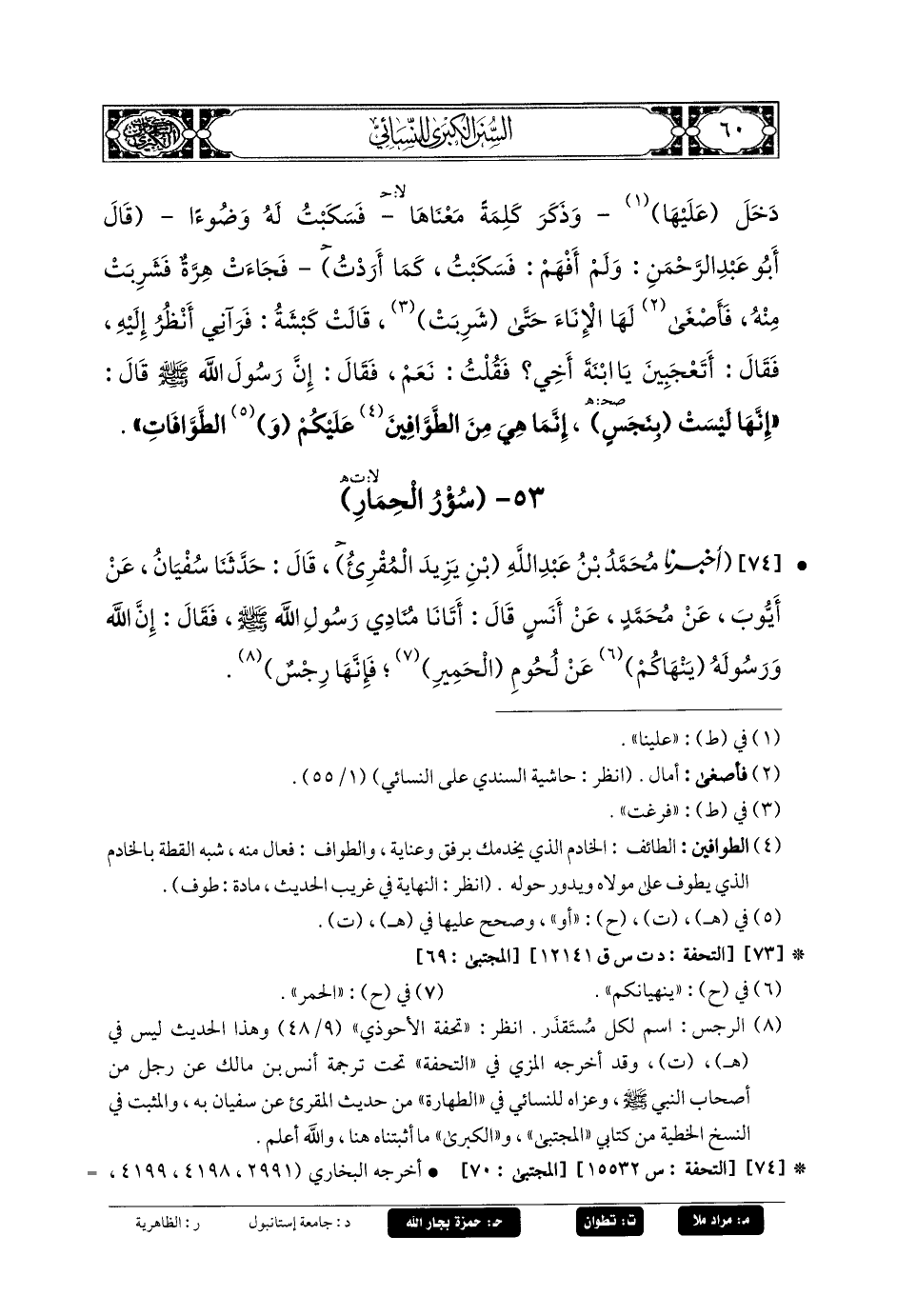 74- أَخبَرنا مُحَمدُ بنُ عَبدِ اللهِ بنِ يَزِيدَ المُقْرِئُ، قَالَ: حَدثنا سُفيانُ، عَن أَيوبَ، عَن مُحَمدٍ، عَن أَنَسٍ، قَالَ: أَتَانَا مُنَادِي رَسُولَ اللهِ صَلى الله عَليه وسَلم، فَقَالَ: إِنَّ اللهَ وَرَسُولَهُ يَنْهَاكُمْ عَنِ لُحُومِ الحَمِيرِ فَإِنَّهَا رِجْسٌ.