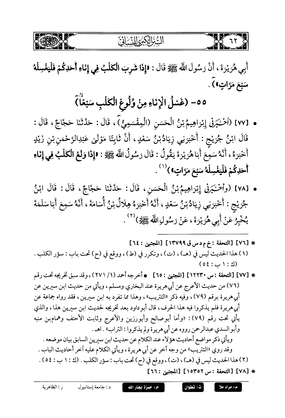77- أَخبَرني إِبرَاهِيمُ بنُ الحَسَنِ المِقْسَمِيُّ، قَالَ: حَدثنا حَجَّاجٌ، قَالَ: قَالَ ابنُ جُرَيْجٍ: أَخبَرني زِيَادُ بنُ سَعْدٍ، أَنَّ ثَابِتًا مَوْلَى عَبدِ الرَّحمَنِ بنِ زَيْدٍ أَخبَرَهُ، أَنَّهُ سَمِعَ أَبَا هُرَيرَةَ، يَقُولُ: قَالَ رَسُولُ اللهِ صَلى الله عَليه وسَلم: إِذَا وَلَغَ الكَلْبُ فِي إِنَاءِ أَحَدِكُمْ فَلْيَغْسِلْهُ سَبْعَ مَرَّاتٍ.