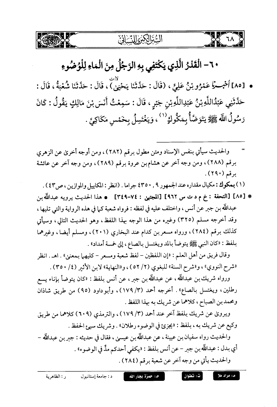 85- أَخبَرنا عَمرُو بنُ عَليٍّ، قَالَ: حَدثنا يَحيَى، قَالَ: حَدثنا شُعبَةُ، قَالَ: حَدَّثني عَبدُ اللهِ بنُ عَبدِ اللهِ بنِ جَبْرٍ، قَالَ: سَمِعْتُ أَنَسَ بْنَ مَالِكٍ، يَقُولُ: كَانَ رَسُولُ اللهِ صَلى الله عَليه وسَلم يَتَوَضَّأُ بِمَكُّوكٍ، وَيَغْتَسِلُ بِخَمْسِ مَكَاكِيَّ.
