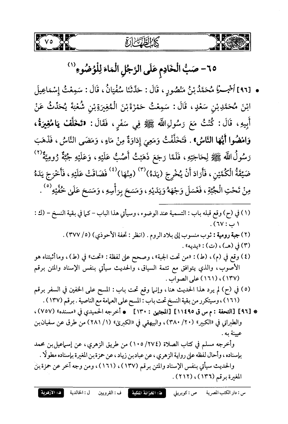 96- أَخبَرنا مُحَمدُ بنُ مَنصُورٍ، قَالَ: حَدثنا سُفيانُ، قَالَ: سَمِعْتُ إِسمَاعِيلَ بْنَ مُحَمدِ بنِ سَعْدٍ، قَالَ: سَمِعْتُ حَمْزَةَ بْنَ المُغِيرَةِ بنِ شُعبَةَ يُحَدِّثُ عَن أَبيهِ، قَالَ: كُنْتُ مَعَ رَسُولِ اللهِ صَلى الله عَليه وسَلم فِي سَفَرٍ، فَقَالَ: تَخَلَّفْ يَا مُغِيرَةُ، وَامْضُوا أَيُّهَا النَّاسُ، فَتَخَلَّفْتُ وَمَعِيَ إِدَاوَةٌ مِنْ مَاءٍ، وَمَضَى النَّاسُ، فَذَهَبَ رَسُولُ اللهِ صَلى الله عَليه وسَلم لِحَاجَتِهِ، فَلَمَّا رَجَعَ ذَهَبْتُ أَصُبُّ عَلَيْهِ وَعَلَيْهِ جُبَّةٌ رُومِيَّةٌ ضَيِّقَةُ الكُمَّيْنِ، فَأَرَادَ أَنْ يُخْرِجَ يَدَيْهِ مِنْهَا فَضَاقَتْ عَلَيْهِ، فَأَخْرَجَ يَدَيْهِ مِنْ تَحْتِ الجُبَّةِ فَغَسَلَ وَجْهَهُ وَيَدَيْهِ، وَمَسَحَ بِرَأْسِهِ، وَمَسَحَ عَلَى خُفَّيْهِ.