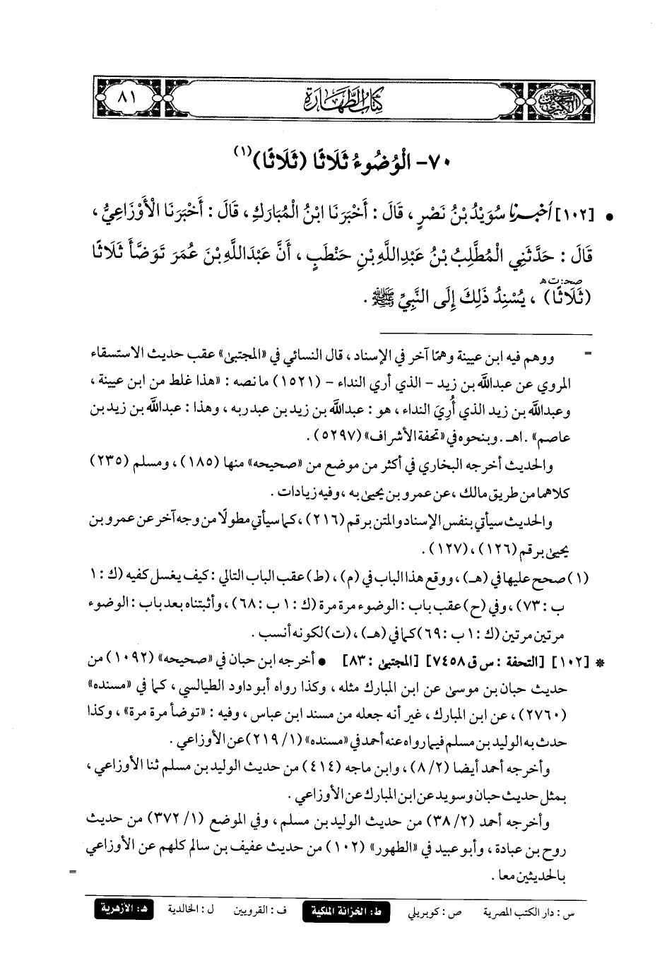 102- أَخبَرنا سُوَيْدُ بنُ نَصْرٍ، قَالَ: أَخبَرنا ابنُ المُبَارَكِ، قَالَ: أَخبَرنا الأَوْزَاعِيُّ، قَالَ: حَدَّثني المُطَّلِبُ بنُ عَبدِ اللهِ بنِ حَنْطَبٍ، أَنَّ عَبدَ اللهِ بْنَ عُمَرَ تَوَضَّأَ ثَلاثًا ثَلاثًا يُسْنَدُ ذَلِكَ إِلَى النَّبيِّ صَلى الله عَليه وسَلم.