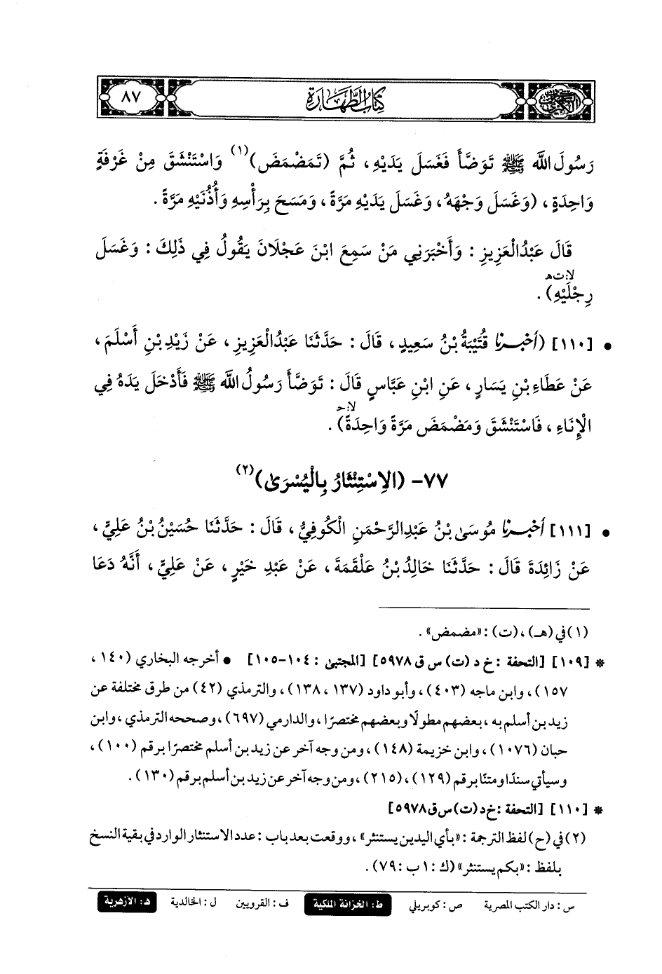 110- أَخبَرنا قُتَيبَةُ بنُ سَعِيدٍ، قَالَ: حَدثنا عَبدُ العَزِيزِ، عَن زَيْدِ بنِ أَسْلَمَ، عَن عَطَاءِ بنِ يَسَارٍ، عَنِ ابنِ عَبَّاسٍ، قَالَ: تَوَضَّأَ رَسُولُ اللهِ صَلى الله عَليه وسَلم فَأَدْخَلَ يَدَهُ فِي الإِنَاءِ فَاسْتَنْشَقَ وَمَضْمَضَ مَرَّةً وَاحِدَةً.