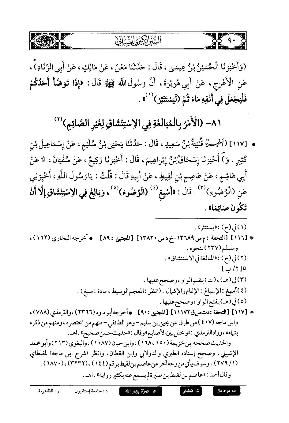 81- الأَمْرُ بِالمُبَالَغَةِ فِي الاِسْتِنْشَاقِ لِغَيْرِ الصَّائِمِ.