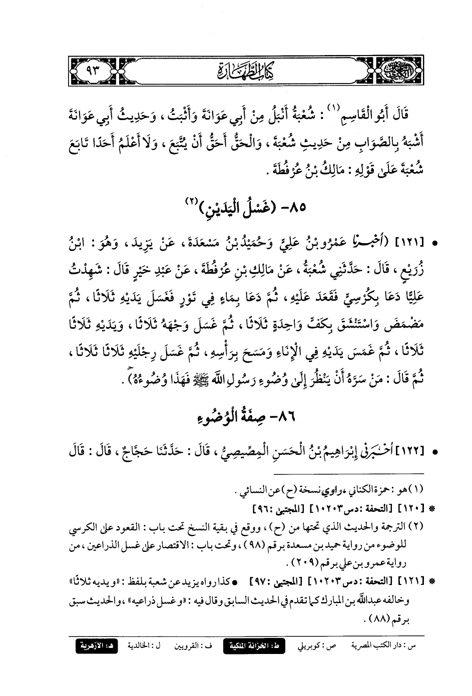 121- أَخبَرَنا عَمرُو بنُ عَليٍّ وَحُمَيْدُ بنُ مَسْعَدَةَ، عَن يَزِيدَ، وَهُوَ ابنُ زُرَيْعٍ، قَالَ: حَدَّثني شُعبَةُ، عَن مَالِكِ بنِ عُرْفُطَةَ، عَن عَبدِ خَيْرٍ قَالَ: شَهِدْتُ عَليًّا دَعَا بِكُرْسِيٍّ فَقَعَدَ عَلَيْهِ، ثُمَّ دَعَا بِمَاءٍ فِي تَوْرٍ فَغَسَلَ يَدَيْهِ ثَلاثًا، ثُمَّ مَضْمَضَ وَاسْتَنْشَقَ بِكَفٍّ وَاحِدَةٍ ثَلاثًا، ثُمَّ غَسَلَ وَجْهَهُ ثَلاثًا، وَيَدَيْهِ ثَلاثًا ثَلاثًا، ثُمَّ غَمَسَ يَدَيْهِ فِي الإِنَاءِ وَمَسَحَ بِرَأْسِهِ، ثُمَّ غَسَلَ رِجْلَيْهِ ثَلاثًا ثَلاثًا، ثُمَّ قَالَ: مَنْ سَرَّهُ أَنْ يَنْظُرَ إِلَى وُضُوءِ رَسُولِ اللهِ صَلى الله عَليهِ وسَلم، فَهَذَا وُضُوءُهُ (1).
