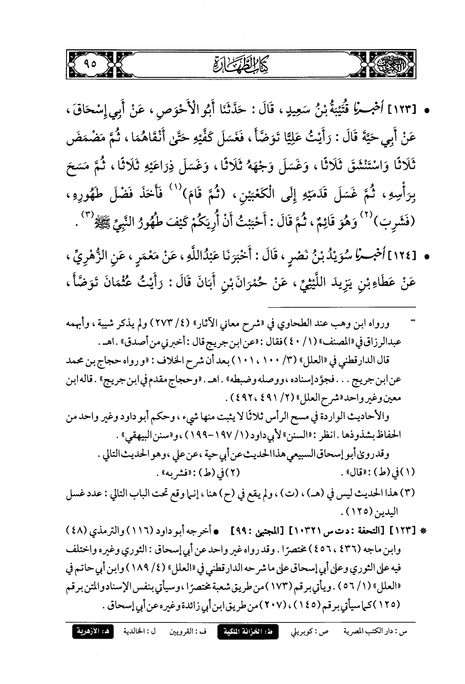 123- أَخبَرنا قُتَيبَةُ بنُ سَعِيدٍ، قَالَ: حَدثنا أَبو الأَحْوَصِ، عَن أَبي إِسحَاقَ، عَن أَبي حَيَّةَ، قَالَ: رَأَيْتُ عَليًّا تَوَضَّأَ فَغَسَلَ كَفَّيْهِ حَتَّى أَنْقَاهُمَا، ثُمَّ مَضْمَضَ ثَلاثًا، وَاسْتَنْشَقَ ثَلاثًا، وَغَسَلَ وَجْهَهُ ثَلاثًا، وَغَسَلَ ذِرَاعَيْهِ ثَلاثًا، ثُمَّ مَسَحَ بِرَأْسِهِ، ثُمَّ غَسَلَ قَدَمَيْهِ إِلَى الكَعْبَيْنِ، ثُمَّ قَامَ فَأَخَذَ فَضْلَ طَهُورِهِ فَشَرِبَ وَهُو قَائِمٌ، ثُمَّ قَالَ: أَحْبَبْتُ أَنْ أُرِيَكُمْ كَيْفَ طُهُورُ النَّبيِّ صَلى الله عَليه وسَلم.