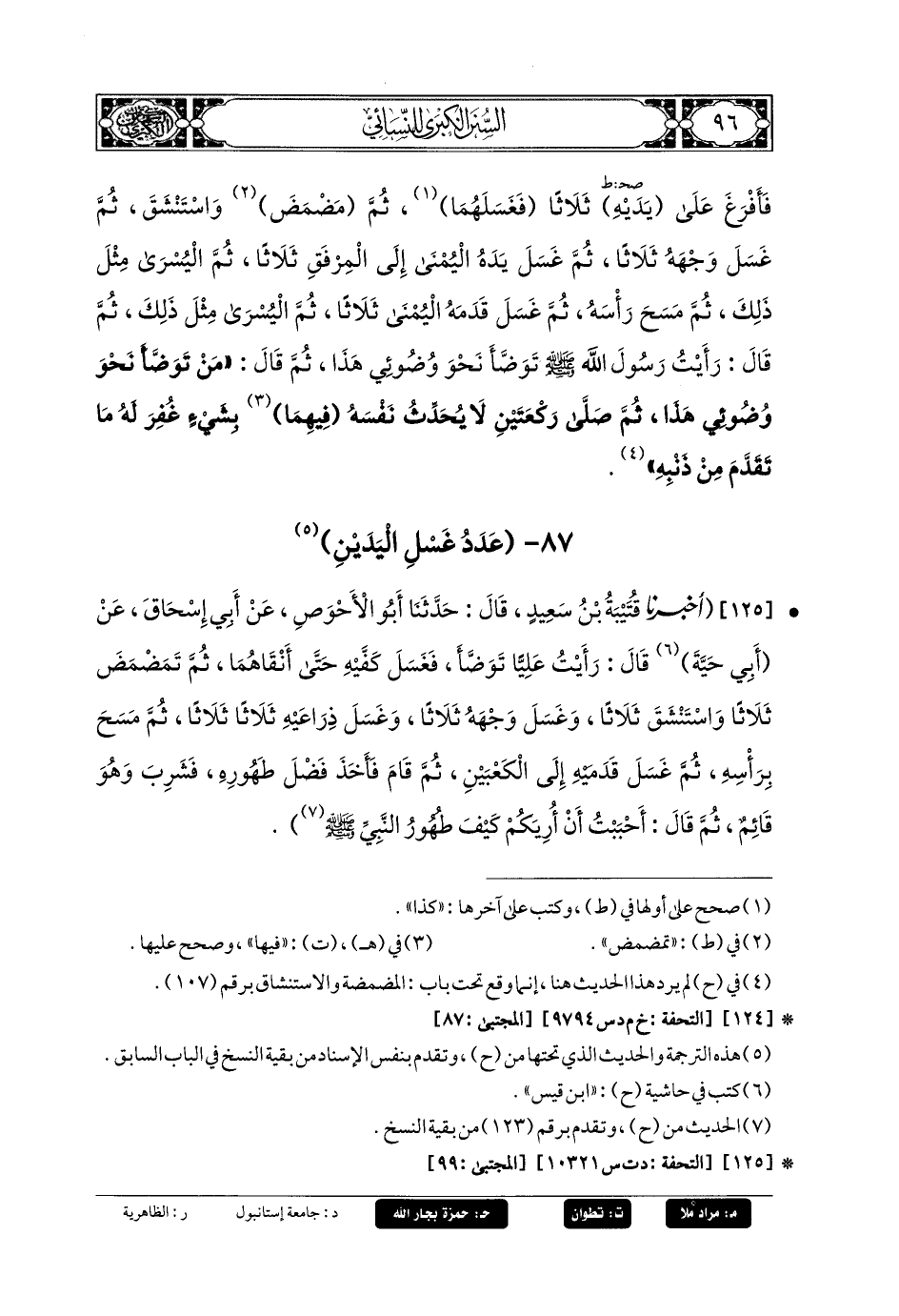 125- أَخبَرنا قُتَيبَةُ بنُ سَعِيدٍ، قَالَ: حَدثنا أَبو الأَحْوَصِ، عَن أَبي إِسحَاقَ، عَن أَبي حَيَّةَ، قَالَ: رَأَيْتُ عَليًّا تَوَضَّأَ فَغَسَلَ كَفَّيْهِ حَتَّى أَنْقَاهُمَا، ثُمَّ تَمَضْمَضَ ثَلاثًا، وَاسْتَنْشَقَ ثَلاثًا، وَغَسَلَ وَجْهَهُ ثَلاثًا، وَغَسَلَ ذِرَاعَيْهِ ثَلاثًا ثَلاثًا، ثُمَّ مَسَحَ بِرَأْسِهِ، ثُمَّ غَسَلَ قَدَمَيْهِ إِلَى الكَعْبَيْنِ، ثُمَّ قَامَ فَأَخَذَ فَضْلَ طَهُورِهِ فَشَرِبَ وَهُو قَائِمٌ، ثُمَّ قَالَ: أَحْبَبْتُ أَنْ أُرِيَكُمْ كَيْفَ طُهُورُ النَّبيِّ صَلى الله عَليه وسَلم.
