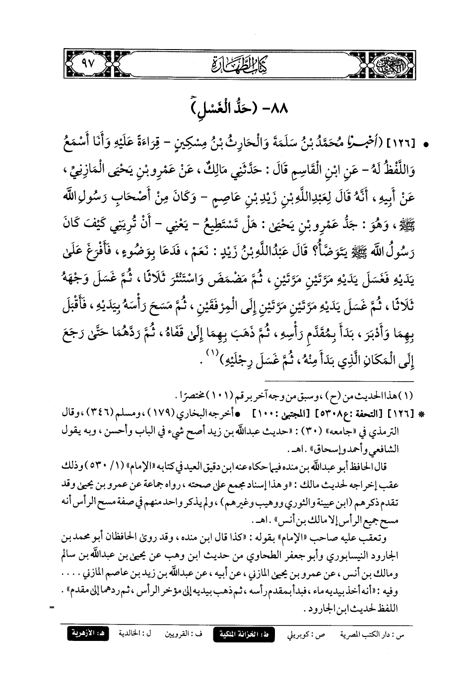 126- أَخبَرَنا مُحَمد بنُ سَلَمَةَ، وَالحَارِثُ بنُ مِسْكِينٍ، قِرَاءَةً عَلَيْهِ وَأَنَا أَسْمَعُ، وَاللَّفْظُ لَهُ، عَنِ ابنِ القَاسِمِ، قَالَ: حَدَّثني مَالِكٌ، عَن عَمْرِو بنِ يَحيَى المَازِنِيِّ، عَن أَبيهِ، أَنَّهُ قَالَ لِعَبدِ اللهِ بنِ زَيْدِ بنِ عَاصِمٍ وَكَانَ مِنْ أَصْحَابِ رَسُولِ اللهِ صَلى الله عَليهِ وسَلم، وَهُوَ جَدُّ عَمْرِو بنِ يَحيَى: هَلْ تَسْتَطِيعُ يَعْنِي أَنْ تُرِيَنِي كَيْفَ كَانَ رَسُولُ اللهِ صَلى الله عَليهِ وسَلم يَتَوَضَّأُ؟ قَالَ عَبدُ اللهِ بنُ زَيْدٍ: نَعَمْ، فَدَعَا بِوَضُوءٍ، فَأَفْرَغَ عَلَى يَدَيْهِ فَغَسَلَ يَدَيْهِ مَرَّتَيْنِ مَرَّتَيْنِ، ثُمَّ مَضْمَضَ وَاسْتَنْثَرَ ثَلاثًا، ثُمَّ غَسَلَ وَجْهَهُ ثَلاثًا، ثُمَّ غَسَلَ يَدَيْهِ مَرَّتَيْنِ مَرَّتَيْنِ إِلَى المِرْفَقَيْنِ، ثُمَّ مَسَحَ رَأْسَهُ بِيَدَيْهِ فَأَقْبَلَ بِهِمَا وَأَدْبَرَ، بَدَأَ بِمُقَدَّمِ رَأْسِهِ، ثُمَّ ذَهَبَ بِهِمَا إِلَى قَفَاهُ، ثُمَّ رَدَّهُمَا حَتَّى رَجَعَ إِلَى المَكَانِ الَّذِي بَدَأَ مِنْهُ، ثُمَّ غَسَلَ رِجْلَيْهِ (1).