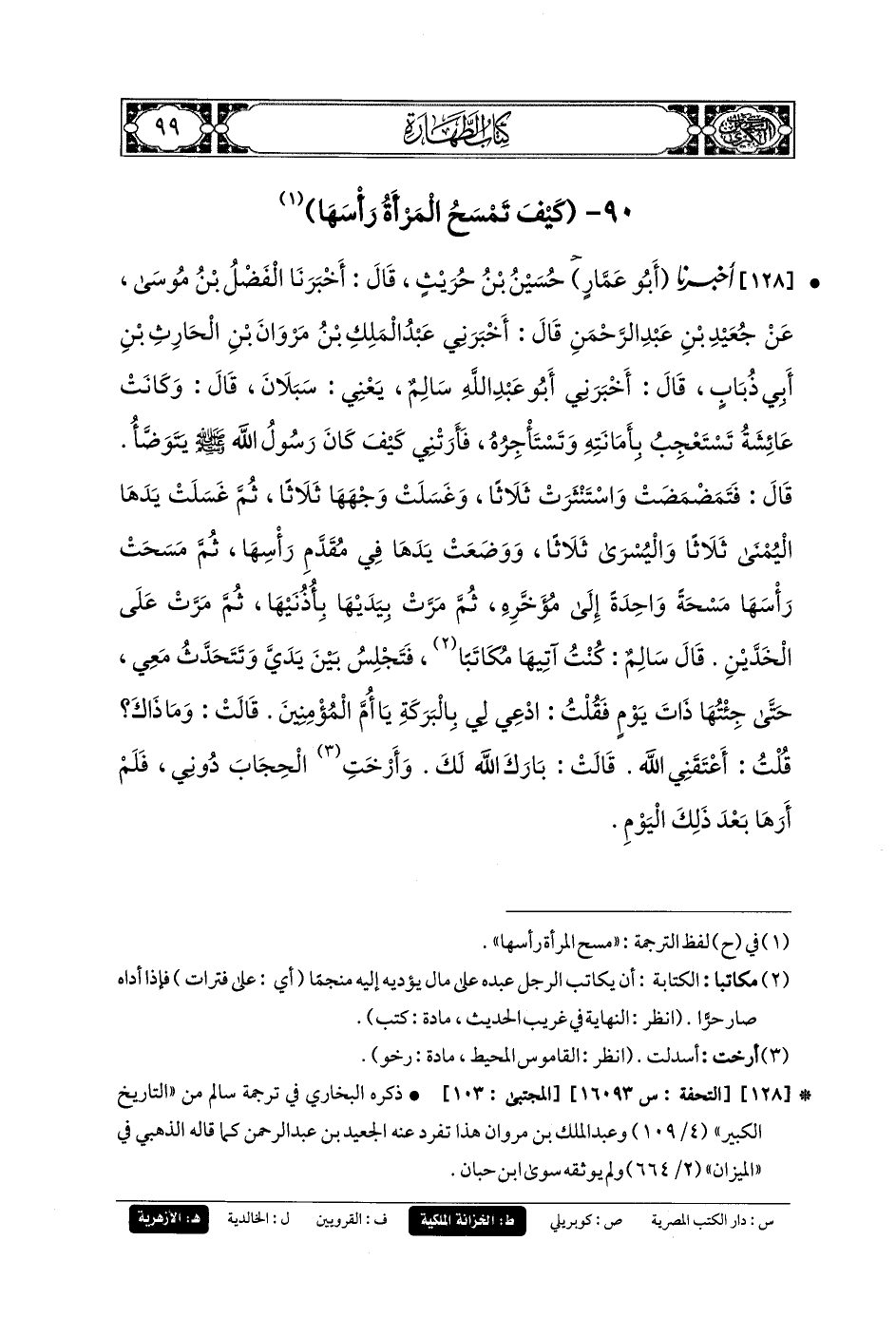 128- أَخبَرنا أبُو عَمَّارٍ حُسَيْنُ بنُ حُرَيْثٍ، قَالَ: أَنْبأَنَا الفَضْلُ بنُ مُوسَى، عَن جُعَيْدِ بنِ عَبدِ الرَّحمَنِ، قَالَ: أَخبَرني عَبدُ المَلِكِ بنُ مَرْوَانَ بنِ الحَارِثِ بنِ أَبي ذُبَابٍ، قَالَ: أَخبَرني أَبو عَبدِ اللهِ سَالِمٌ، يَعْنِي سَبَلانَ، قَالَ: وَكَانَتْ عَائِشَةُ تَسْتَعْجِبُ بِأَمَانَتِهِ وَتَسْتَأْجِرُهُ، فَأَرَتْنِي كَيْفَ كَانَ رَسُولُ اللهِ صَلى الله عَليه وسَلم يَتَوَضَّأُ، قَالَ: فَتَمَضْمَضَتْ وَاسْتَنْثَرَتْ ثَلاثًا، وَغَسَلَتْ وَجْهَهَا ثَلاثًا، ثُمَّ غَسَلَتْ يَدَهَا اليُمْنَى ثَلاثًا، وَاليُسْرَى ثَلاثًا، وَوَضَعَتْ يَدَهَا فِي مُقَدَّمِ رَأْسِهَا، ثُمَّ مَسَحَتْ رَأْسَهَا مَسْحَةً وَاحِدَةً إِلَى مُؤَخَّرِهِ، ثُمَّ مَرَّتْ بِيَدَيْهَا بِأُذُنَيْهَا، ثُمَّ مَرَّتْ عَلَى الخَدَّيْنِ، قَالَ سَالِمٌ: كُنْتُ آتِيَهَا مُكَاتَبًا فَتَجْلِسُ بَيْنَ يَدَيَّ، وَتَتَحَدَّثُ مَعِي، حَتَّى جِئْتُهَا ذَاتَ يَوْمٍ، فَقُلْتُ: ادْعِي لِي بِالبَرَكَةِ يَا أُمَّ المُؤْمِنِينَ، قَالَتْ: وَمَا ذَاكَ، قُلْتُ: أَعْتَقَنِي اللهُ، قَالَتْ: بَارِكَ اللهُ لَكَ، وَأَرْخَتِ الحِجَابَ دُونِي فَلَمْ أَرَهَا بَعْدَ ذَلِكَ اليَوْمِ.