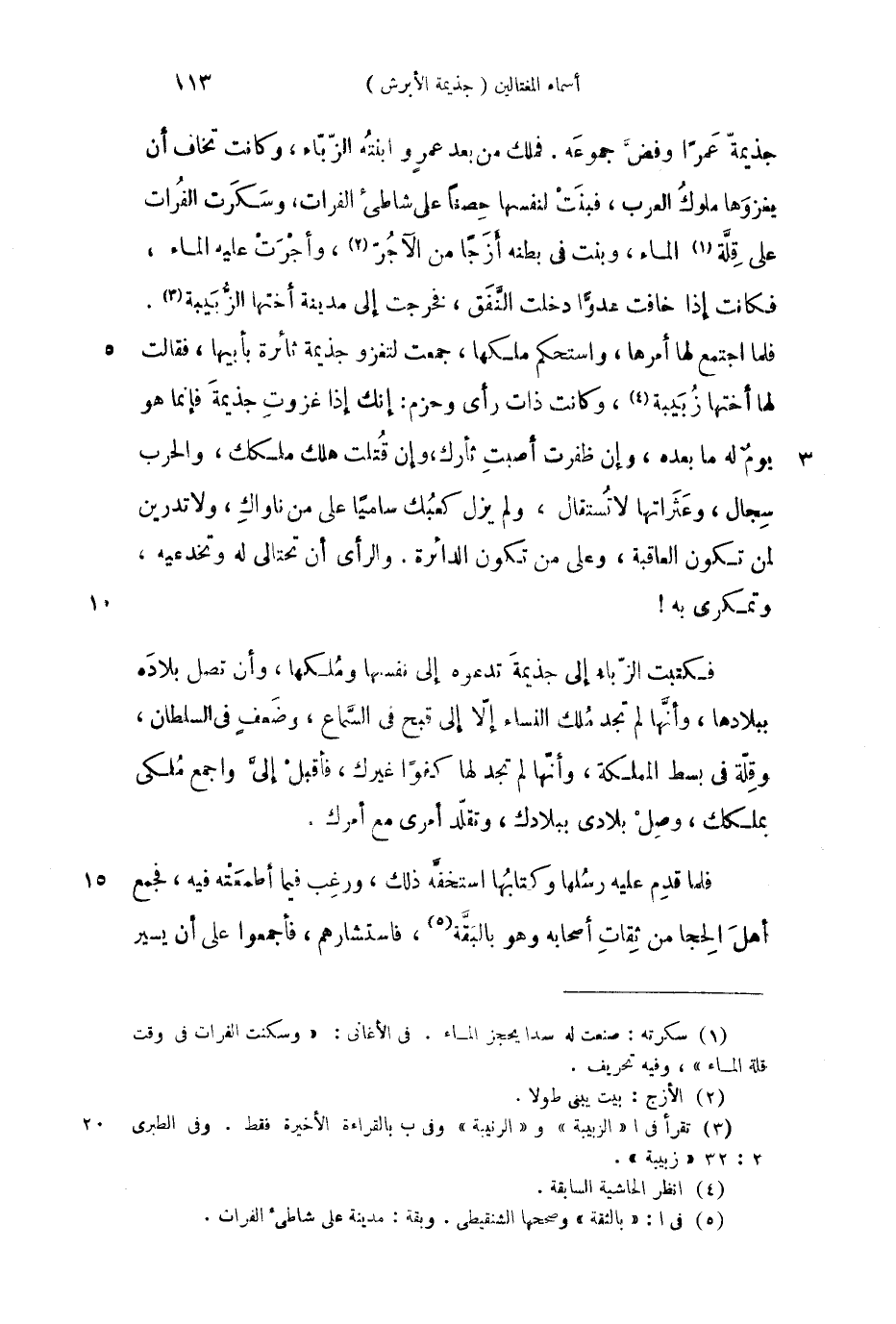 جذيمة عمراً وفض جموعه. فملك من بعد عمرو ابنته الزباء، وكانت تخاف أن يغزوها ملوك العرب، فبنت لنفسها حصاناً على شاطئ الفرات، وسكرت الفرات على قلة الماء، وبنت في بطنه أزجاً من الآجر، وأجرت عليه الماء، فكانت إذا خافت عدواً دخلت النفق، فخرجت إلى مدينة أختها الزبيبة. فلما اجتمع لها أمرها، واستحكم ملكها، جمعت لتغزو جذيمة ثائرة بأبيها، فقالت لها أختها زبيبة، وكانت ذات رأي وحز: إنك إذا غزوت جذيمة فإنما هو يوم ما بعده، وإن ظفرت أصبت ثأرك، وإن قتلت هلك ملكك، والحرب سجال، وعثرتها لا تستقال، ولم يزل كعبك سامياً على من ناواك، ولا تدرين لمن تكون العاقبة، وعلى من تكون الدائرة. والرأي أمن تحتالي له وتخدعيه وتمكري به!.