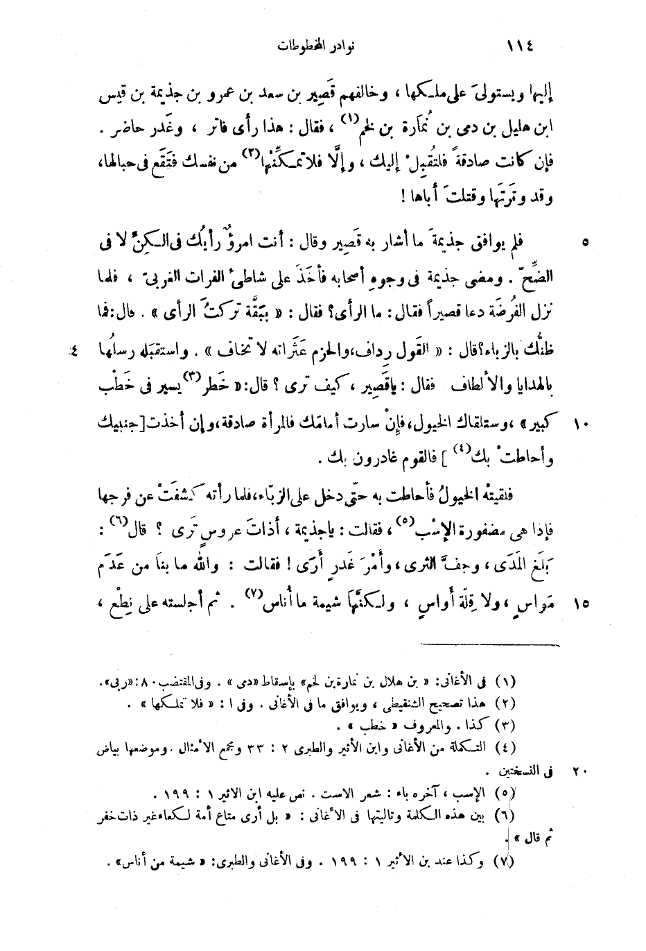 إليها ويستولي على ملكها، وخالفهم قصير بن سعد بن عمرو بن جذيمة بن قيس ابن هليل بن دمي بن نمارة لابن لخم، فقال: هذا رأي فاتر، هذا رأي فاتر، وغدر حاضر. فإن كانت صادقة فلتقبل إليك، وإلا فلا تمكنها من نفسك فتقع في حبالها، وقد وترتها وقتلت أباها! فلم يوافق جذيمة ما أشار به قصير وقال: أنت امرؤ رأيك في الكن لا في الضح. ومضى جذيمة في وجوه أصحابه فأخذ على شاطئ الفرات الغربي، فلما نزل الفرضة دعا قصيراً فقال: ما الرأي؟ فقال: "ببقة تركت الرأي". قال: فما ظنك بالزباء؟ قال: "القول رادف، والحزم عثراته لا تخاف". واستقبله رسلها بالهدايا والألطاف فقال: يا قصير، كيف ترى؟ قال: "خطر يسر في خطب كبير"، وستلقاك الخيول، فإن سارت أمامك فالمرأة صادقة، وإن أخذت [جنبيك وأحاطت بك] فالقوم غادرون بك.